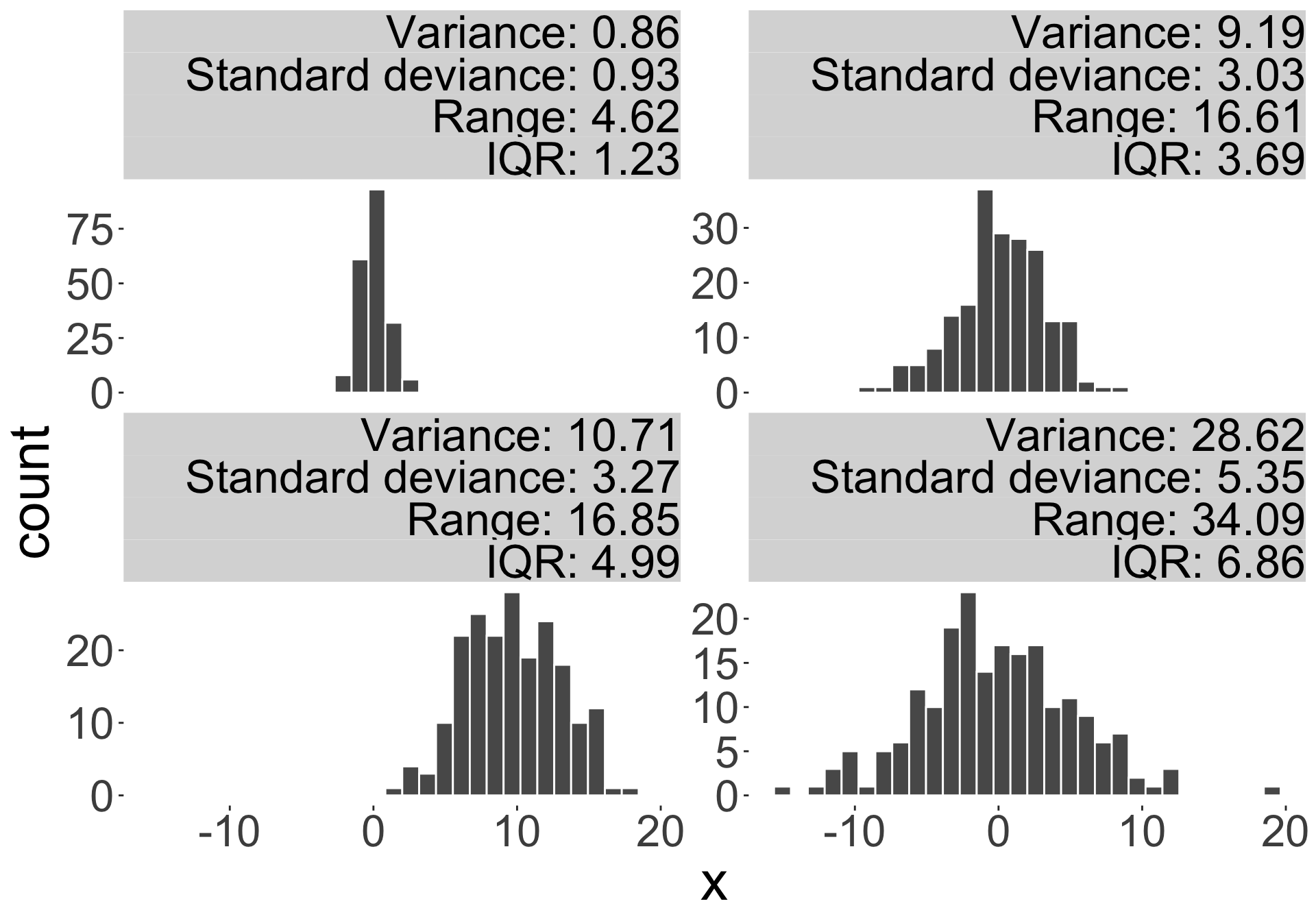 Population variance: \[\sigma^2 = \frac{1}{N}\sum_{i=1}^{N} (x_{i'} - \mu)^2.\]