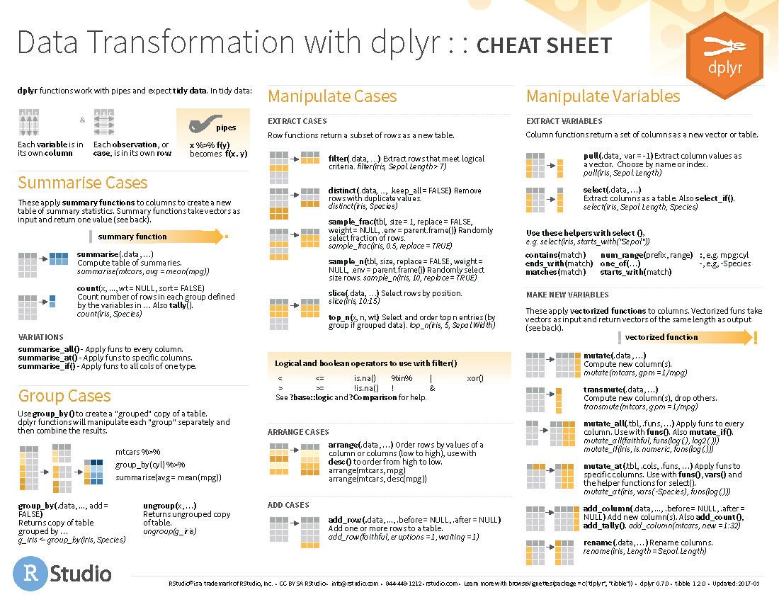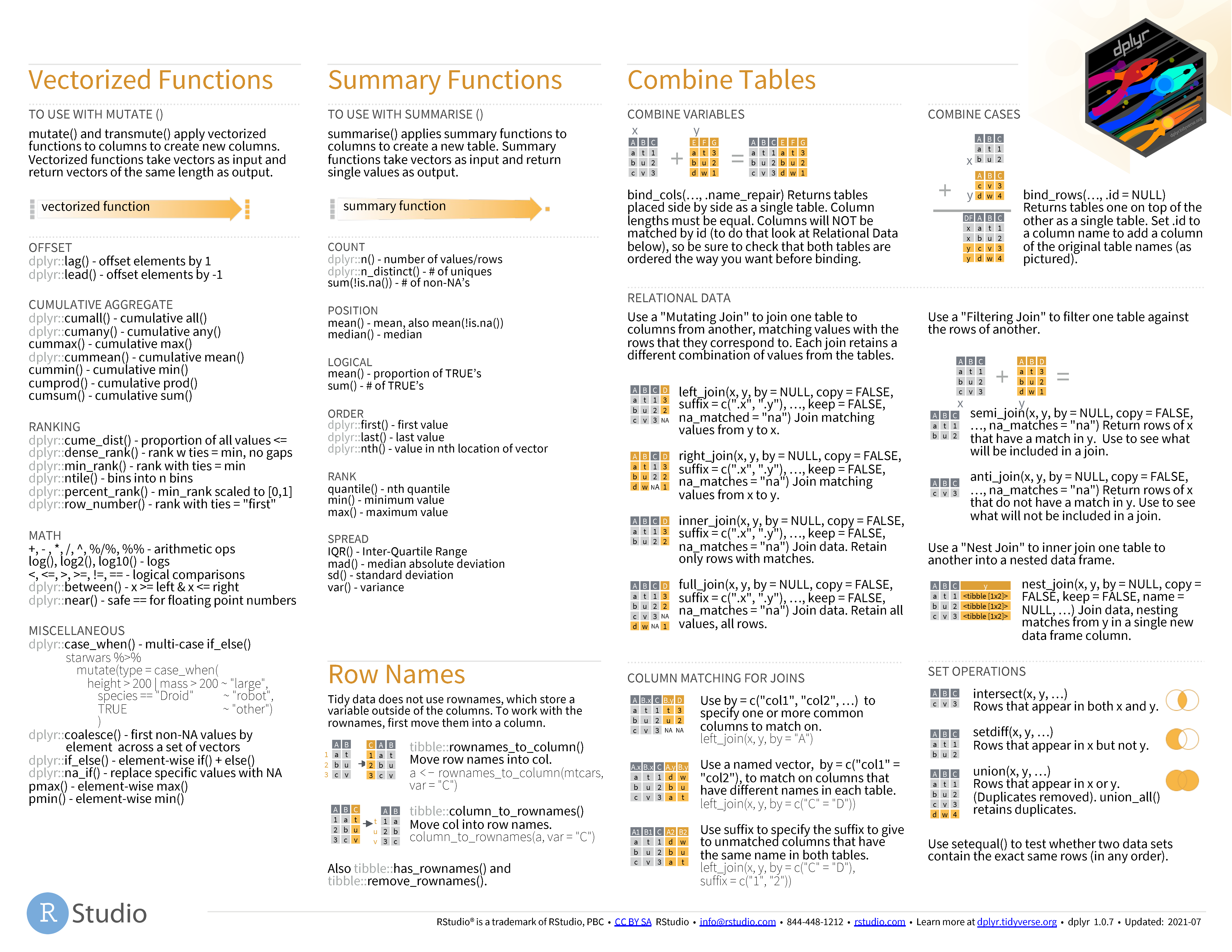 select() along with everything() to reorder columns.relocate() to move columns around.summarise() function allows you to calculate statistical summaries by group.n() function is a special function that counts the number of observations in each group.by for group operations.across() function allows you to apply functions to multiple columns.dplyr provides a grammar of data manipulation.dplyr are verbs that take a data.frame (or tibble) as the first argument.dplyr cheatsheet