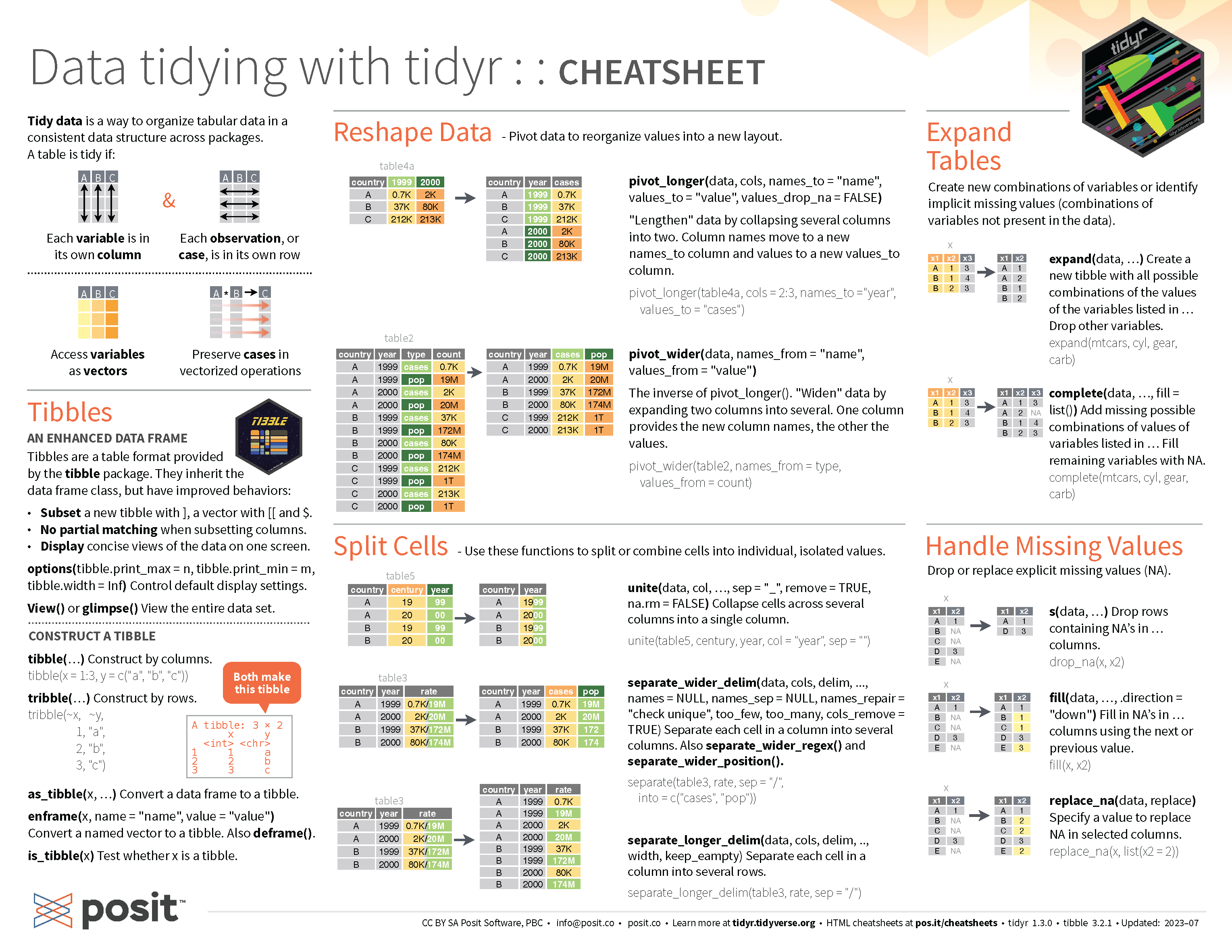 tidyr package provides tools for data cleaning and reshaping.pivot_longer() and pivot_wider() are used to convert data between long and wide formats.separate_wider_delim() and separate_longer_delim() functions are used to split a single column into multiple columns or rows.
