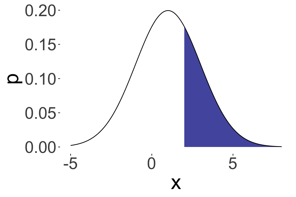 \(P(X > 2)\) where \(X \sim N(1, 2)\)
