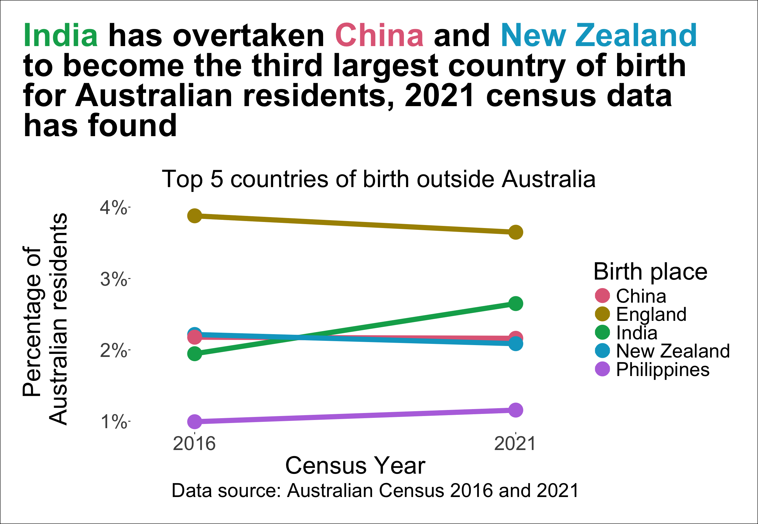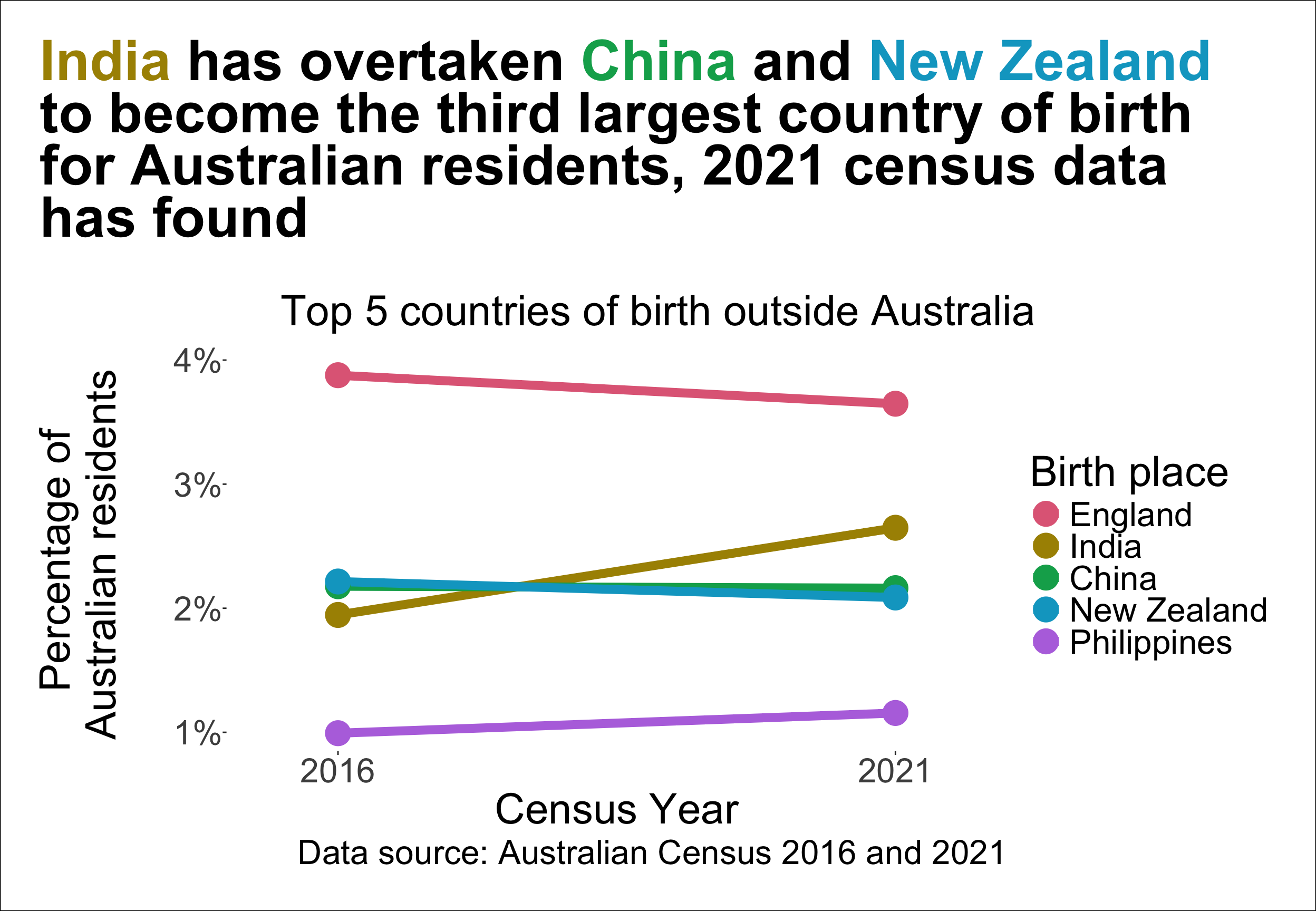 India has overtaken China and New Zealand to become the third largest country of birth for Australian residents, 2021 census data has found.