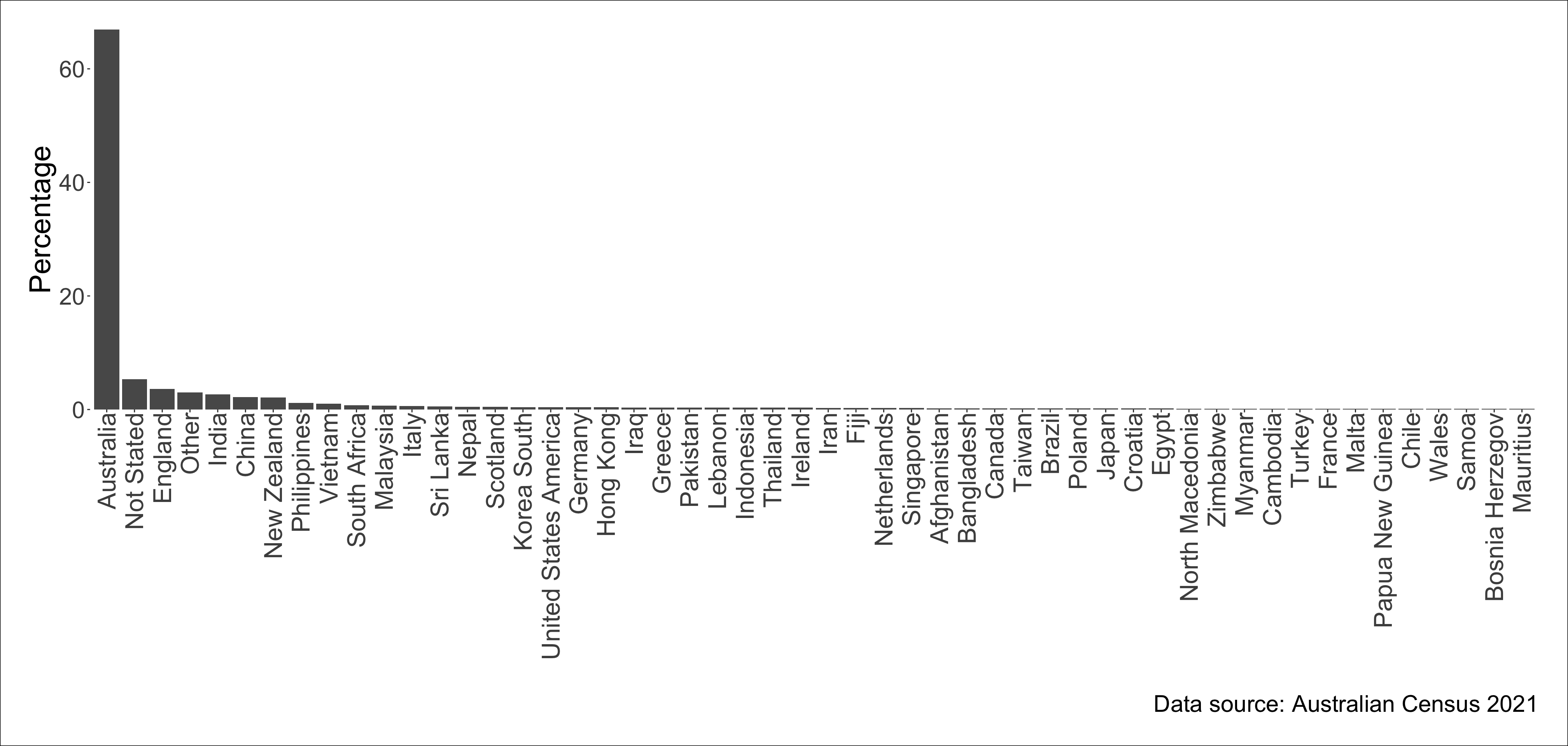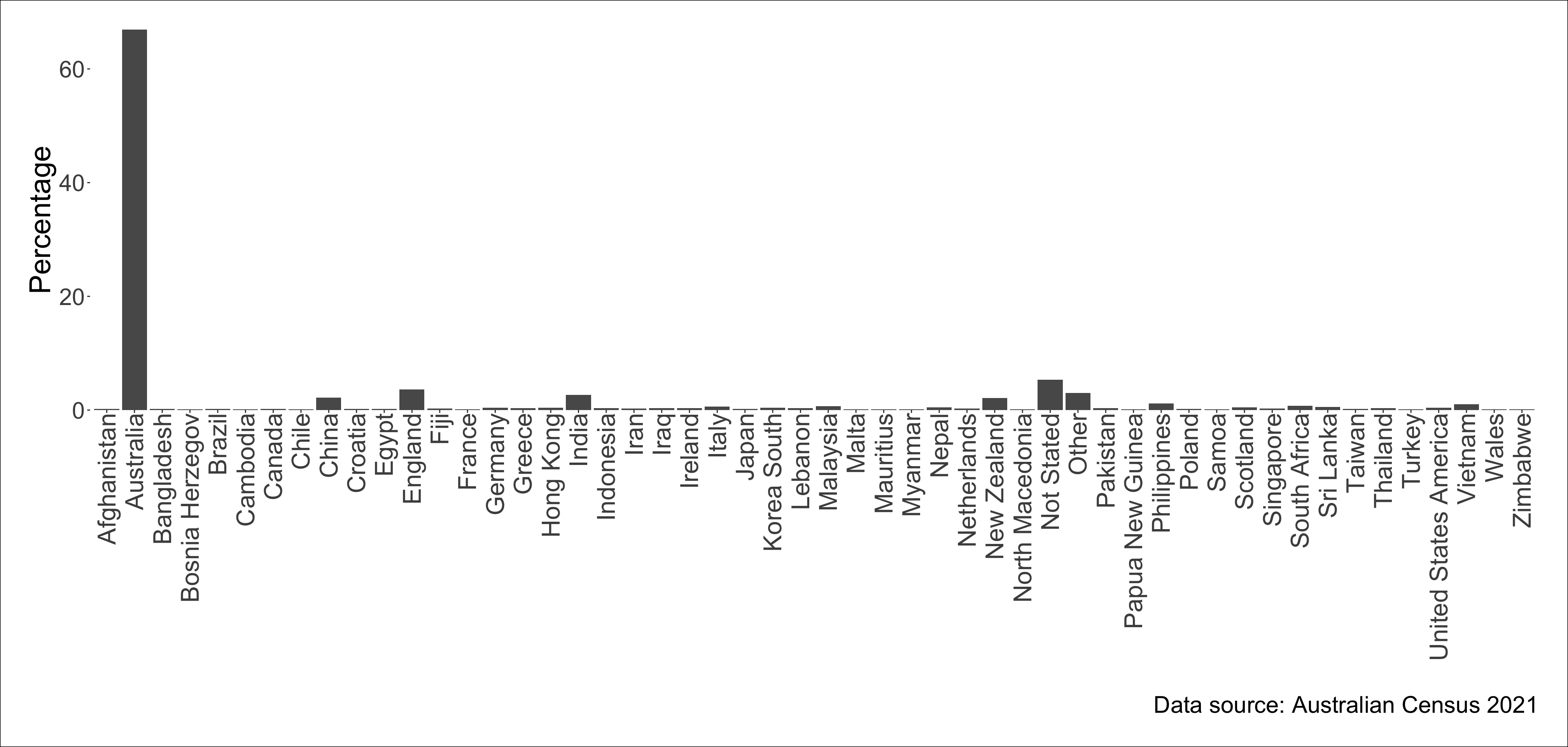The top country of birth place is Australia with 66.9% of Australian residents born in Australia.