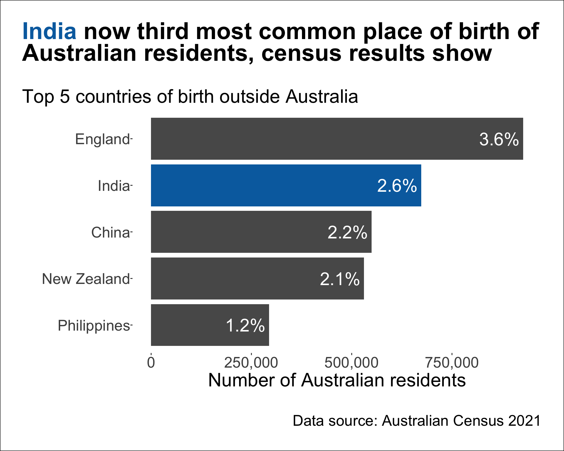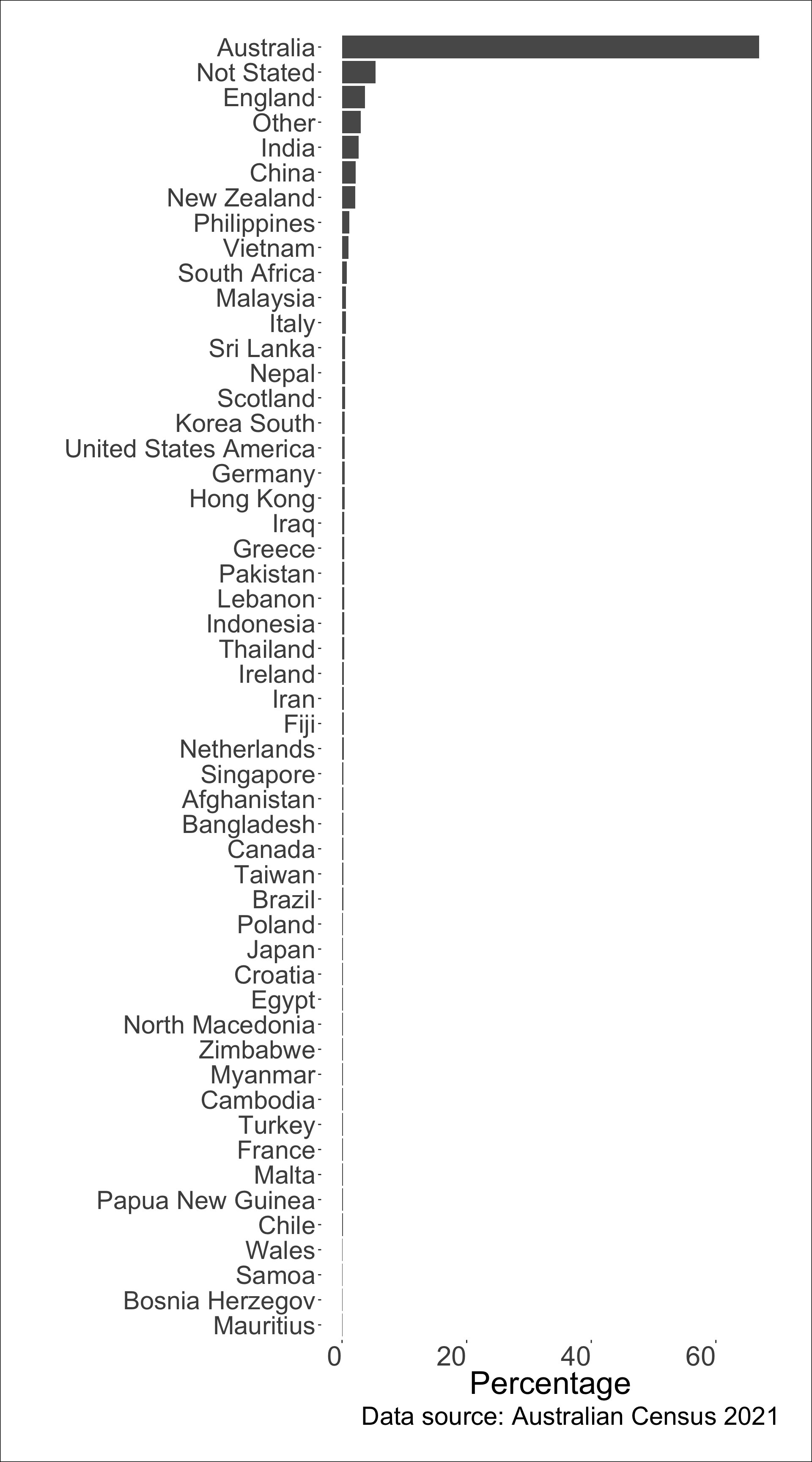 The text on the bar shows the percentage out of 25,422,788 Australian residents born in the corresponding country.