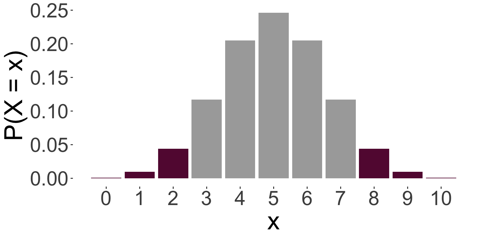 The p-value is \(P(|X - E(X)| \geq |x - E(X)|) = P(|X - 5| \geq 2) = P(X \leq 3) + P(X \geq 7)\).