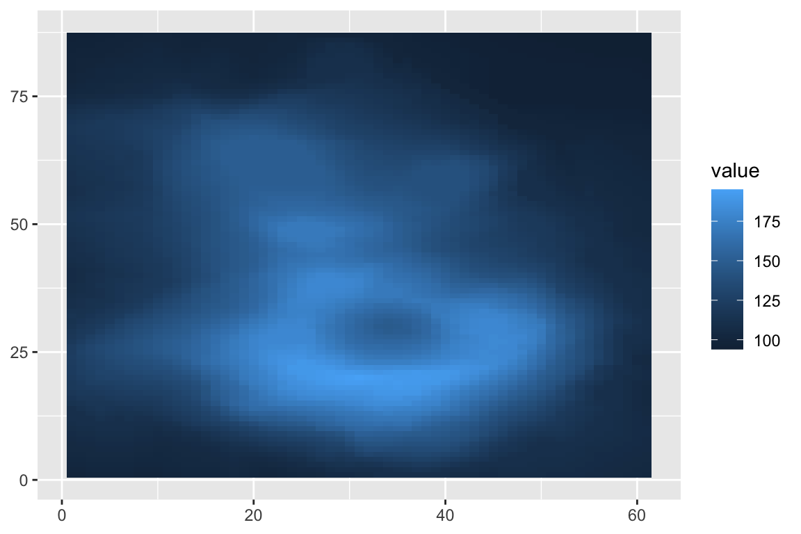 I() operator to mean “as-is” in aesthetic mapping.ggplot() but not attributes like this.geom_hex()geom_bin_2d()geom_bin_2d() is the same as geom_hex() but the shape is a rectangle instead of a hexagon.geom_count()geom_count() counts the number of points in the same locationsize.geom_density_2d()geom_density_2d() is useful.MASS::kde2d().geom_density_2d_filled()geom_density_2d() draws the contour linegeom_density_2d_filled() draws the contour bandsggplot first.volcanod <- data.frame(row = as.vector(row(volcano)),