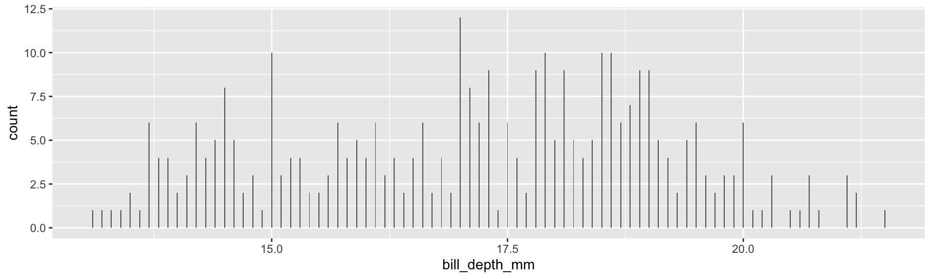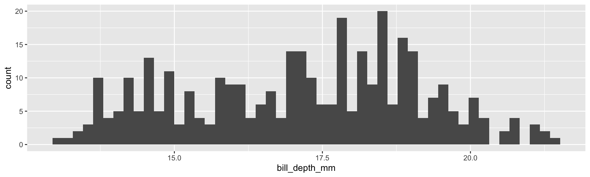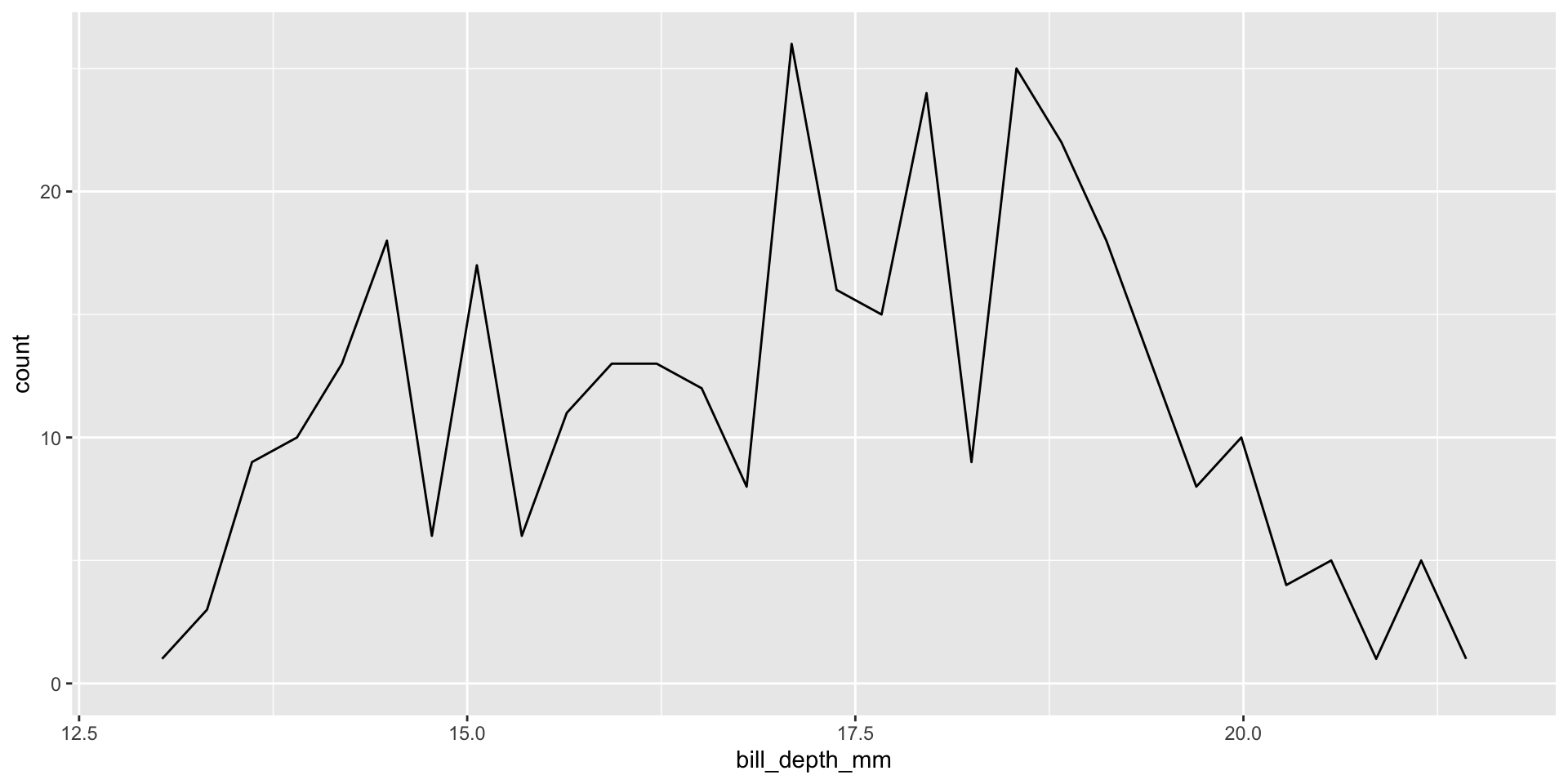 data =, mapping =, x =, and y = each time.ggplotgeom - the geometric object to use display the datastat - statistical transformation to use on the datadata - data to be displayed in this layer (usually inherited)mapping - aesthetic mappings (usually inherited)position - position adjustmentgeom_ or (less commonly) stat_.layer() function.geom_histogram()ggplot2 uses 30 bins (bins = 30) when drawing histograms.geom layers in ggplot2?geom_histogram) have more details about available parameters.bins = 30.?geom_freqpoly to see the help file on the histogram layer.ghist <- ggplot(data = penguins,