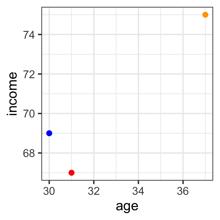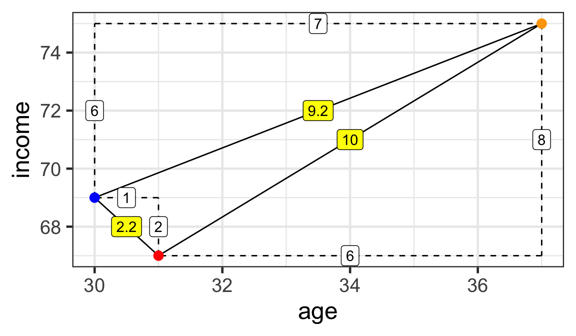 D_{Euclidean}\left(\boldsymbol{x}_{i},\boldsymbol{x}_{j}\right)=\sqrt{\sum\limits_{s=1}^p \left(x_{is}-x_{js}\right)^2}.
