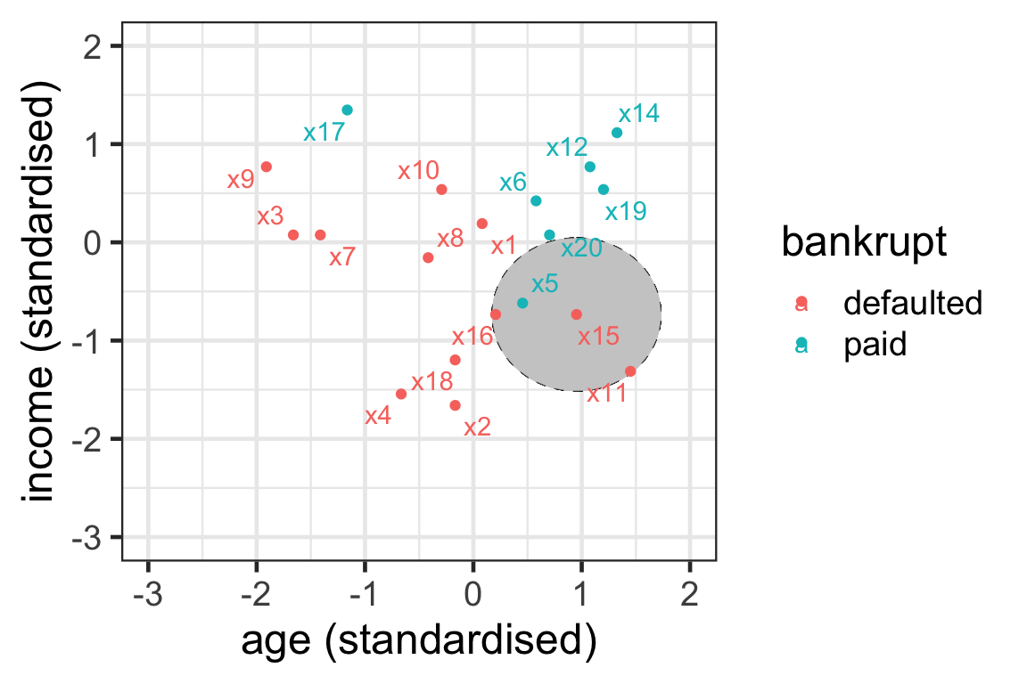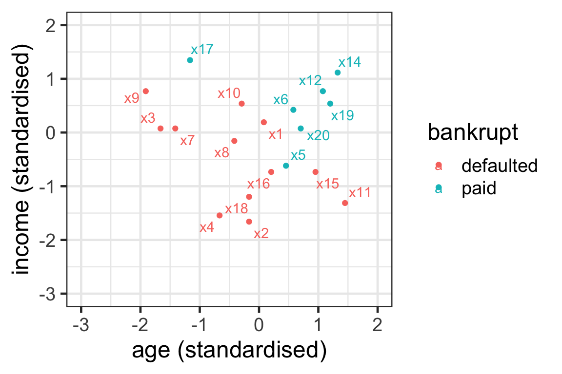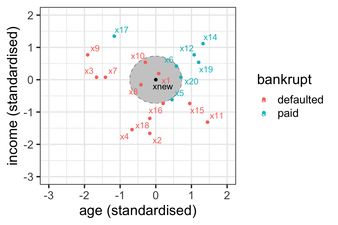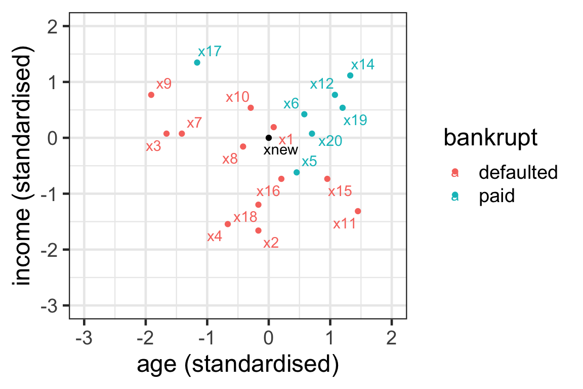 To compute the propensity score of the new record in the example, paid is class 1 and defaulted class 2.