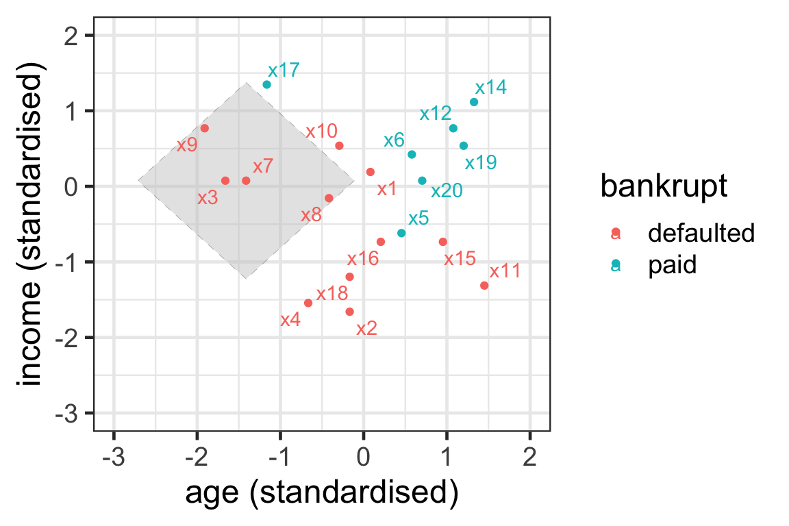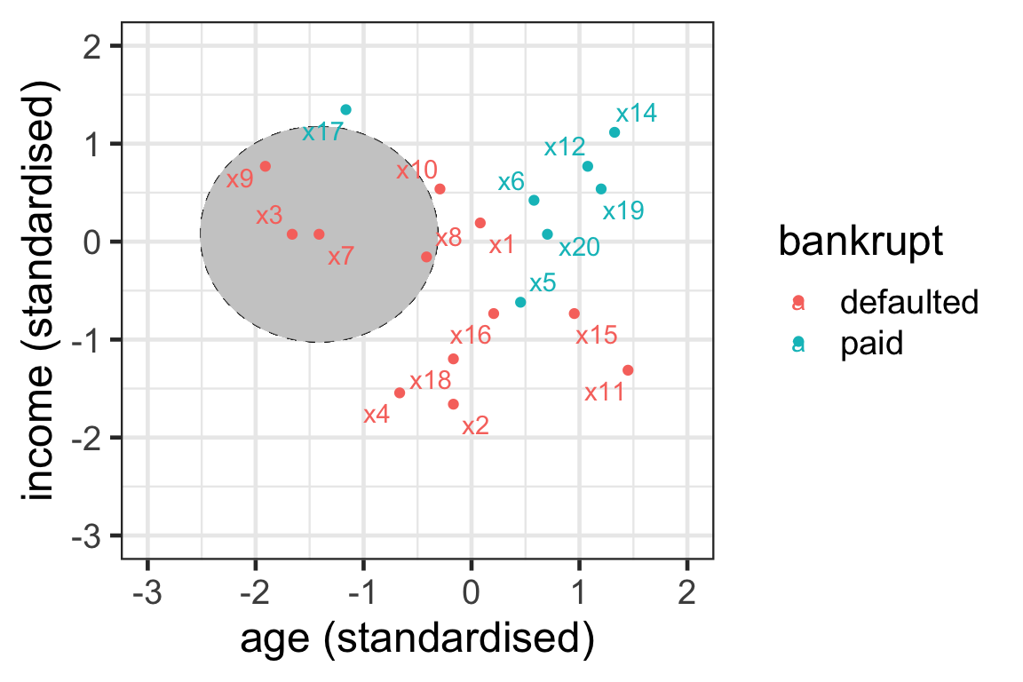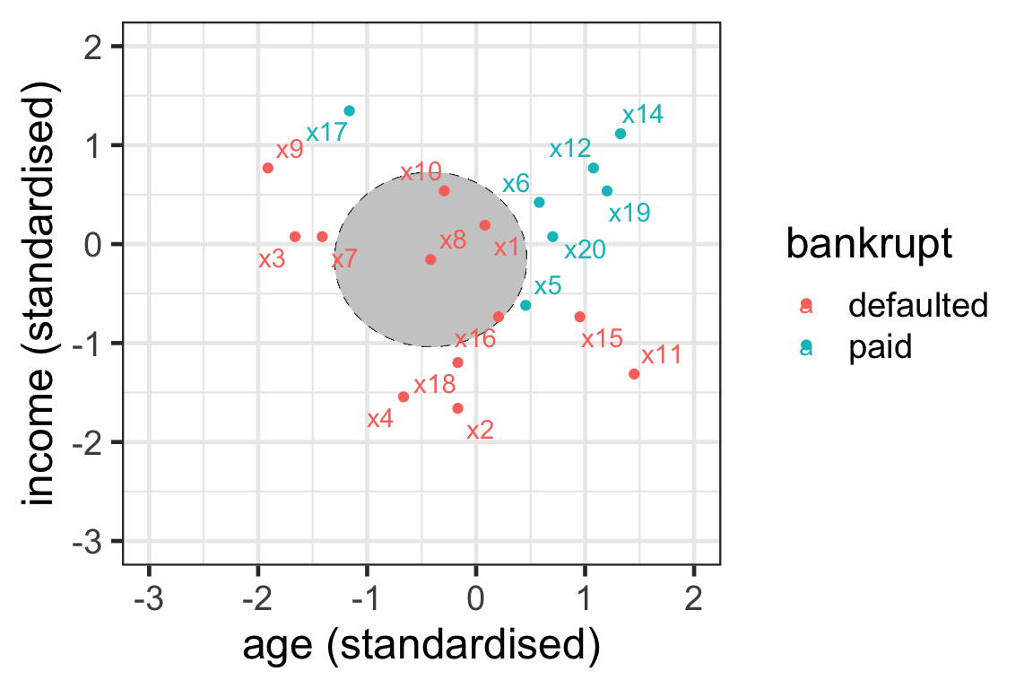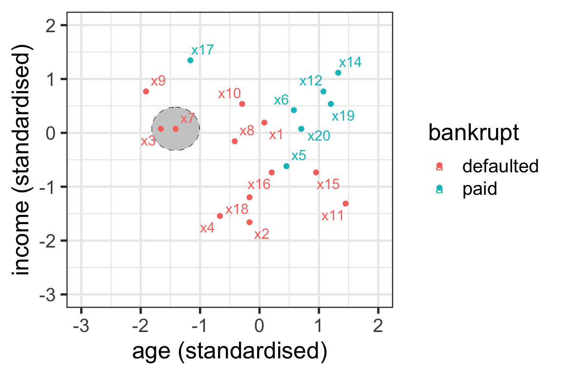 To compute the propensity score of the new record in the example, paid is class 1 and defaulted class 2.