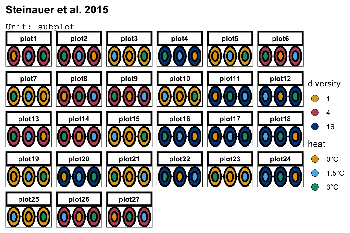 Soil samples of three subplots in each of 27 experimental plots were taken; due to technical difficulties we could only analyze 66 samples out of 81 existing subplots (monoculture, 10 replicates in ambient +0°C treatment, eight replicates in +1.5°C treatment, nine replicates in +3°C treatment; four species mixture, six replicates in ambient +0°C treatment, six replicates in +1.5°C treatment, seven replicates in +3°C treatment; 16 species mixture, six replicates in ambient +0°C treatment, six replicates in +1.5°C treatment, eight replicates in +3°C treatment). The BAC plots are a representative subset of the plots in the biodiversity experiment E120 at Cedar Creek, which were assembled as random draws of a given number of species from the species pool (Zak et al. 2003). Given low heterogeneity of soil abiotic conditions at the start of the experiment, the experiment was not blocked.
