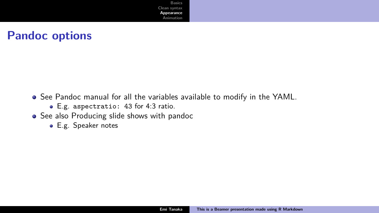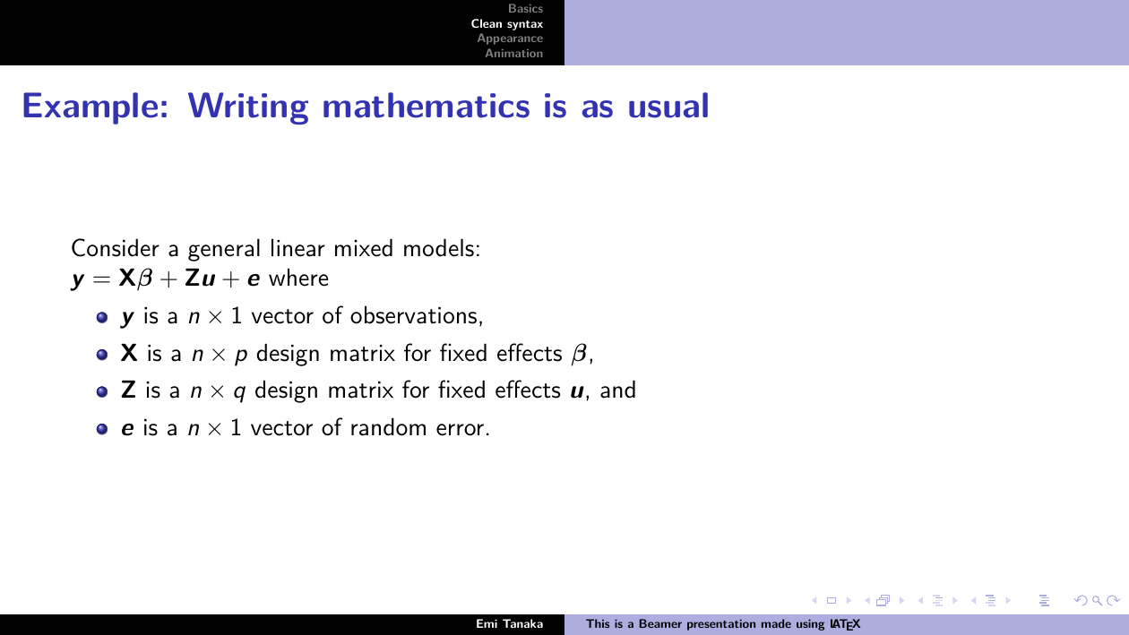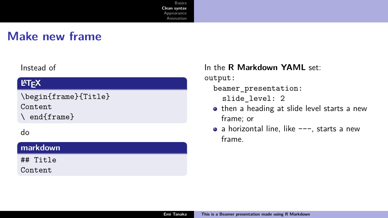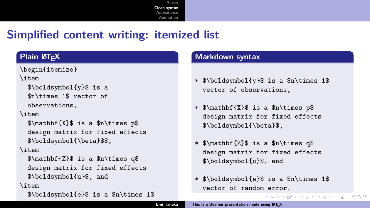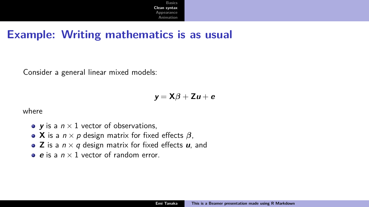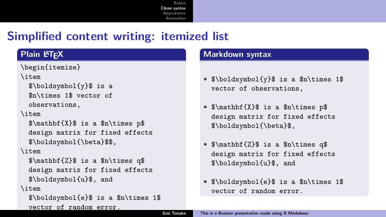 <br> This talk is NOT about: -- <br> <i class='fa fa-times'></i> how to present well or communicate -- <br> <i class='fa fa-times'></i> how to design your slides --- class: monash-bg-blue center middle white <span style="font-size:3em">🎯</span> <br> <i class='fas fa-check'></i> Learn about Beamer <i class="fas fa-handshake"></i> R Markdown -- <br> <i class='fas fa-check'></i> Why care about R Markdown? -- <br> <i class='fas fa-check'></i> Get started with `xaringan` = R Markdown <i class="fas fa-handshake"></i> `remark.js` <i class="fas fa-user-plus"></i> HTML/CSS/JS -- <br> <i class='fas fa-check'></i> Why HTML slides? -- <br> <i class="fas fa-question-circle"></i> Questions? Do ask away! <span style="font-size:3em">👩🏻💻</span> --- background-image: url("images/bg3.jpg") background-size: cover <div class="cursive-font" style="font-size:34pt!important;position:absolute;top:50%;left:30%;transform:rotate(6deg);width:500px;"> For the beamer users who are yet to use <br>R Markdown </div> --- # Beamer LaTeX document class .grid[ .item[ `example-beamer-clean.tex` .scroll-fit50[ ````{=latex} \documentclass[10pt,aspectratio=169]{beamer} \usepackage{amssymb,amsmath} \usepackage{lmodern} \usepackage{hyperref, url} \usetheme{Copenhagen} \usecolortheme{dolphin} \usefonttheme{structurebold} \title{This is a Beamer presentation made using \LaTeX} \subtitle{} \author{Emi Tanaka} \date{30th June 2020} \institute{Monash University} \begin{document} \frame{\titlepage} \begin{frame} \tableofcontents[hideallsubsections] \end{frame} \section{Basics} \begin{frame}{Setting up the YAML} \begin{block}{R Markdown YAML} \texttt{output:\ beamer\_presentation} \end{block} Also check out the \href{https://github.com/eddelbuettel/binb}{\texttt{binb} R-package}. \end{frame} \section{Clean syntax} \begin{frame}{Example: Writing mathematics is as usual} Consider a general linear mixed models: $\boldsymbol{y} = \mathbf{X}\boldsymbol{\beta} + \mathbf{Z}\boldsymbol{u} + \boldsymbol{e}$ where \begin{itemize} \item $\boldsymbol{y}$ is a $n\times 1$ vector of observations, \item $\mathbf{X}$ is a $n\times p$ design matrix for fixed effects $\boldsymbol{\beta}$, \item $\mathbf{Z}$ is a $n\times q$ design matrix for fixed effects $\boldsymbol{u}$, and \item $\boldsymbol{e}$ is a $n\times 1$ vector of random error. \end{itemize} \end{frame} \begin{frame}[fragile]{Simplified content writing: itemized list} \begin{columns}[T] \begin{column}{0.48\textwidth} \begin{block}{Plain \LaTeX} \small \begin{verbatim} \begin{itemize} \item $\boldsymbol{y}$ is a $n\times 1$ vector of observations, \item $\mathbf{X}$ is a $n\times p$ design matrix for fixed effects $\boldsymbol{\beta}$$, \item $\mathbf{Z}$ is a $n\times q$ design matrix for fixed effects $\boldsymbol{u}$, and \item $\boldsymbol{e}$ is a $n\times 1$ vector of random error. \end{itemize} \end{verbatim} \end{block} \end{column} \begin{column}{0.48\textwidth} \begin{block}{Markdown syntax} \small \vspace{0.5cm} \begin{verbatim} * $\boldsymbol{y}$ is a $n\times 1$ vector of observations, * $\mathbf{X}$ is a $n\times p$ design matrix for fixed effects $\boldsymbol{\beta}$, * $\mathbf{Z}$ is a $n\times q$ design matrix for fixed effects $\boldsymbol{u}$, and * $\boldsymbol{e}$ is a $n\times 1$ vector of random error. \end{verbatim} \end{block} \end{column} \end{columns} \end{frame} \begin{frame}[fragile]{Make new frame} \begin{columns}[T] \begin{column}{0.48\textwidth} Instead of \begin{block}{\LaTeX} \begin{verbatim} \begin{frame}{Title} Content \ end{frame} \end{verbatim} \end{block} do \begin{block}{markdown} \begin{verbatim} ## Title Content \end{verbatim} \end{block} \end{column} \begin{column}{0.48\textwidth} In the \textbf{R Markdown YAML} set: \begin{verbatim} output: beamer_presentation: slide_level: 2 \end{verbatim} \begin{itemize} \item then a heading at slide level starts a new frame; or \item a horizontal line, like \texttt{-\/-\/-}, starts a new frame. \end{itemize} \end{column} \end{columns} \end{frame} \begin{frame}[fragile]{Multi-column output} Stick with \LaTeX or Pandoc syntax (both will work) \begin{columns}[T] \begin{column}{0.48\textwidth} \begin{block}{Plain \LaTeX} \begin{verbatim} \begin{columns} \begin{column}{0.5\textwidth} Column 1 content \end{column} \begin{column}{0.5\textwidth} Column 2 content \end{column} \end{columns} \end{verbatim} \end{block} \end{column} \begin{column}{0.48\textwidth} \begin{block}{Pandoc syntax} \begin{verbatim} :::: columns ::: column Column 1 content ::: ::: column Column 2 content ::: :::: \end{verbatim} \end{block} \end{column} \end{columns} \end{frame} \section{Appearance} \begin{frame}[fragile]{Pandoc options} \begin{itemize} \item See \href{https://pandoc.org/MANUAL.html\#variables-for-beamer-slides}{Pandoc manual} for all the variables available to modify in the YAML. \begin{itemize} \item E.g. \texttt{aspectratio:\ 43} for 4:3 ratio. \end{itemize} \item See also \href{https://pandoc.org/MANUAL.html\#producing-slide-shows-with-pandoc}{Producing slide shows with pandoc} \begin{itemize} \item E.g. Speaker notes \end{itemize} \end{itemize} \end{frame} \begin{frame}[fragile,shrink]{Beamer frame atributes} \begin{verbatim} ## Beamer frame atributes {.shrink} \end{verbatim} \begin{itemize} \item The frame attributes in Section 8.1 of the \href{http://mirror.aarnet.edu.au/pub/CTAN/macros/latex/contrib/beamer/doc/beameruserguide.pdf}{Beamer User's Guide} can be used if inserted after header level as \texttt{\{.attribute\}} where \texttt{attribute} replaced with \begin{itemize} \item \texttt{allowdisplaybreaks} \item \texttt{allowframebreaks} \item \texttt{b} \item \texttt{c} \item \texttt{t} \item \texttt{environment} \item \texttt{label} \item \texttt{plain} \item \texttt{shrink} \item \texttt{standout} \item \texttt{noframenumbering} \end{itemize} \end{itemize} \end{frame} \section{Animation} \begin{frame}[fragile]{Animation} \begin{itemize}[<+->] \item First step \item Second step \item Third step \end{itemize} \pau
