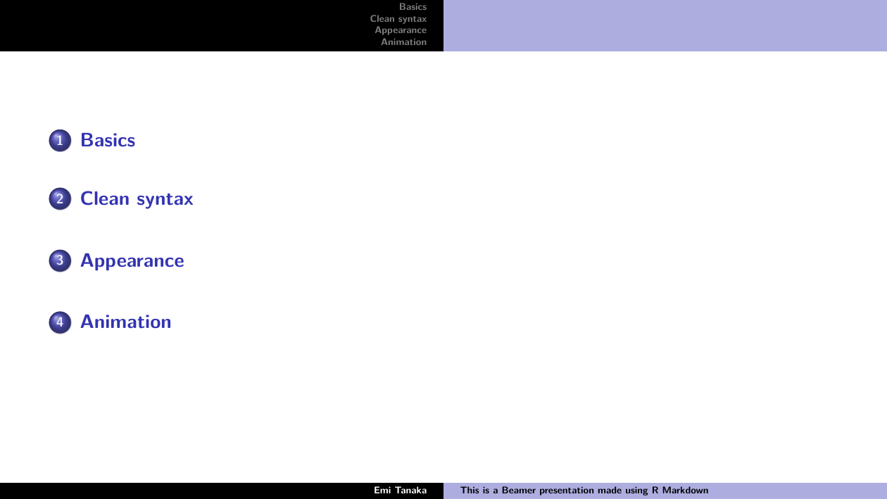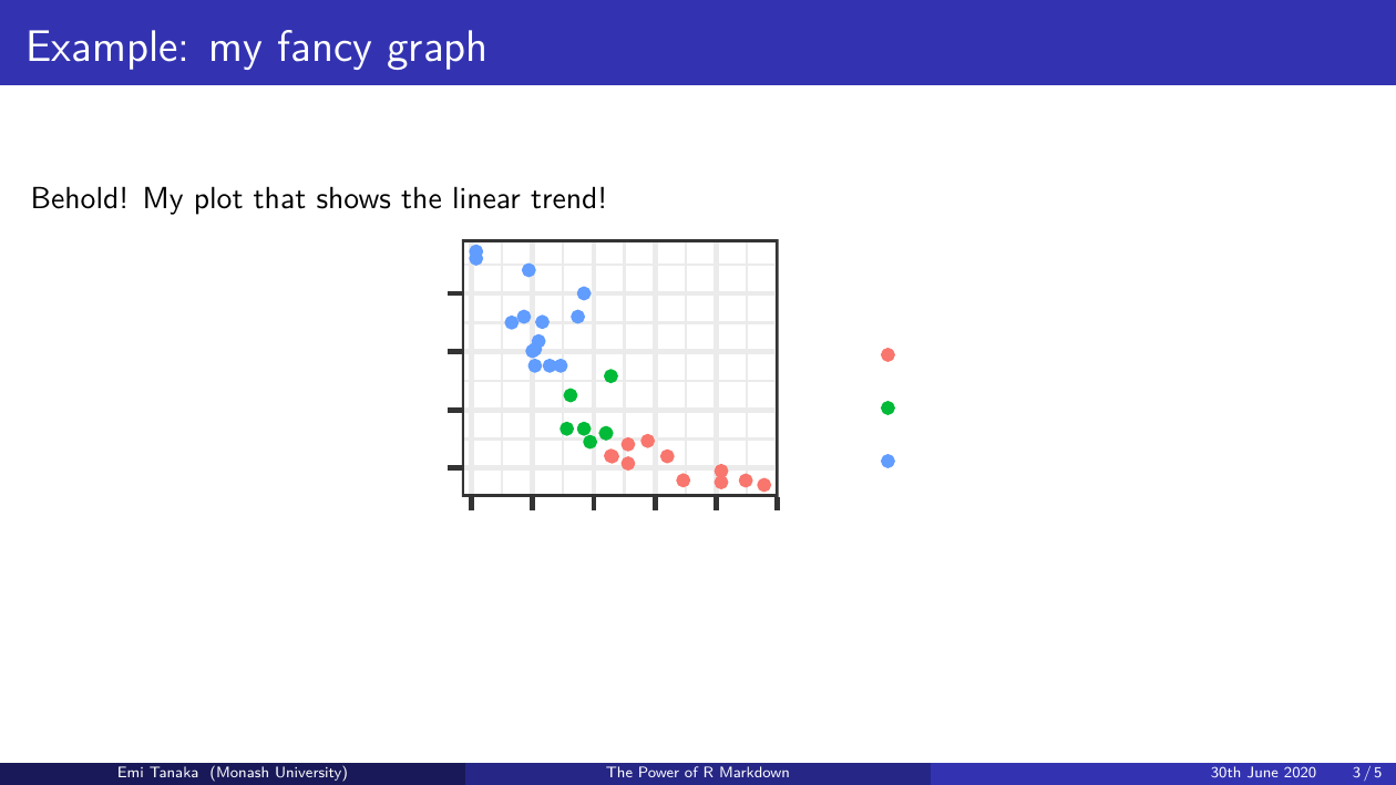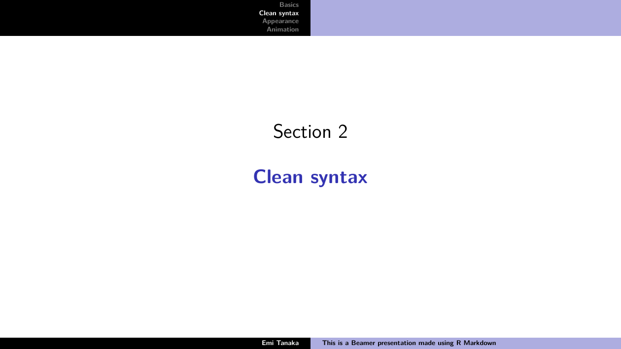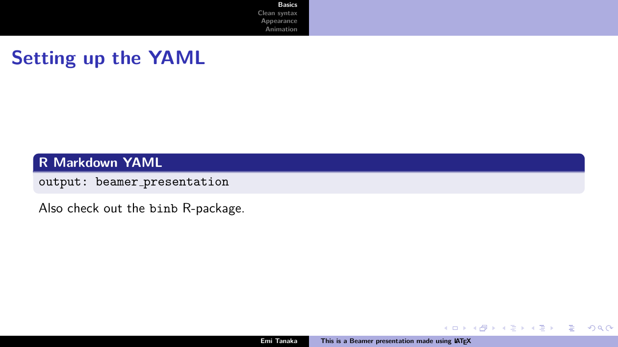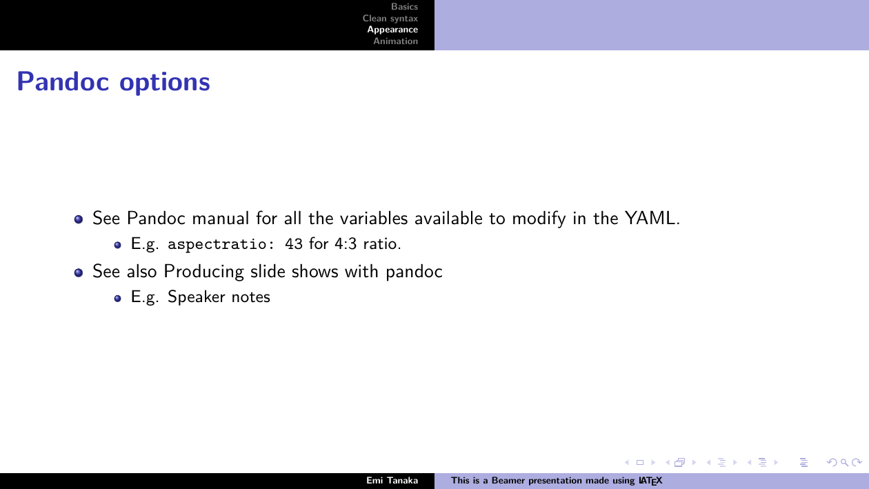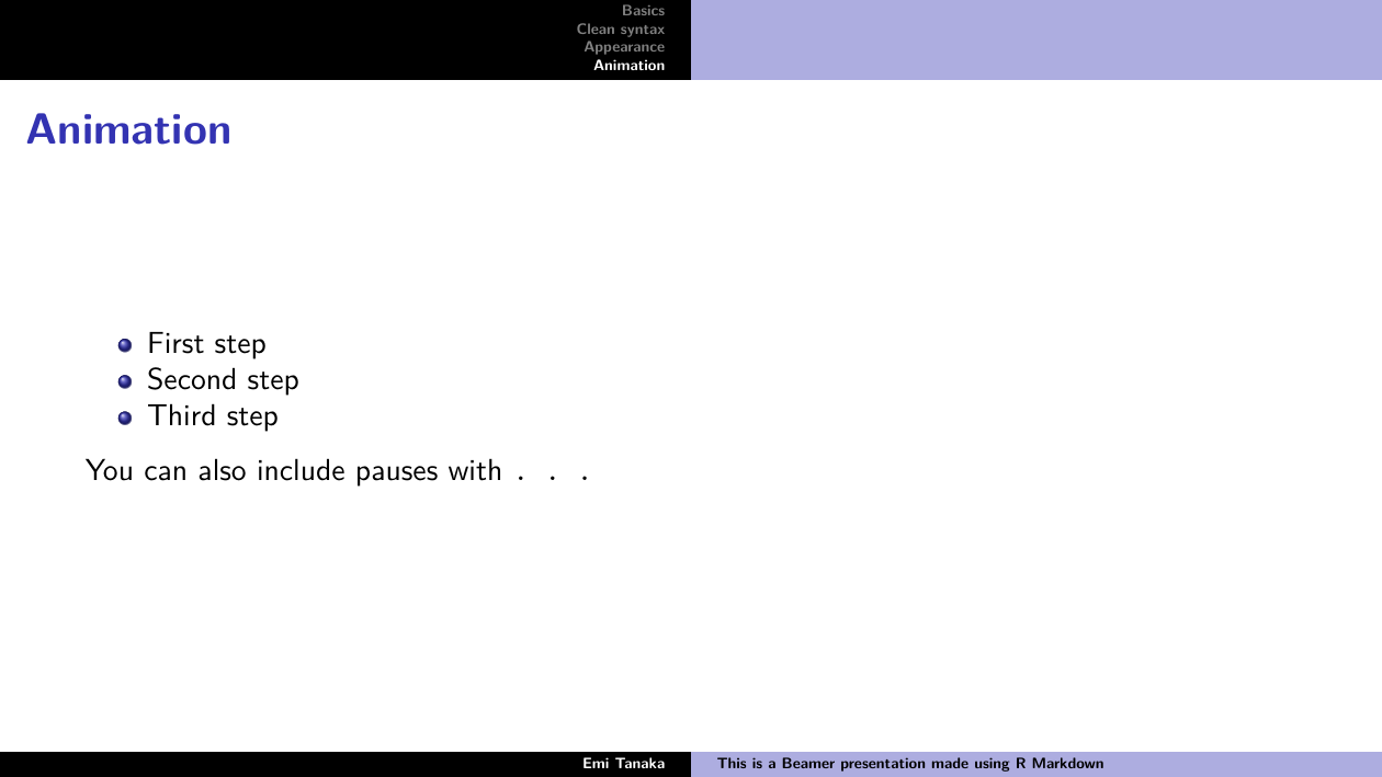 <br> This talk is NOT about: -- <br> <i class='fa fa-times'></i> how to present well or communicate -- <br> <i class='fa fa-times'></i> how to design your slides --- class: monash-bg-blue center middle white <span style="font-size:3em">🎯</span> <br> <i class='fas fa-check'></i> Learn about Beamer <i class="fas fa-handshake"></i> R Markdown -- <br> <i class='fas fa-check'></i> Why care about R Markdown? -- <br> <i class='fas fa-check'></i> Get started with `xaringan` = R Markdown <i class="fas fa-handshake"></i> `remark.js` <i class="fas fa-user-plus"></i> HTML/CSS/JS -- <br> <i class='fas fa-check'></i> Why HTML slides? -- <br> <i class="fas fa-question-circle"></i> Questions? Do ask away! <span style="font-size:3em">👩🏻💻</span> --- background-image: url("images/bg3.jpg") background-size: cover <div class="cursive-font" style="font-size:34pt!important;position:absolute;top:50%;left:30%;transform:rotate(6deg);width:500px;"> For the beamer users who are yet to use <br>R Markdown </div> --- # Beamer LaTeX document class .grid[ .item[ `example-beamer-clean.tex` .scroll-fit50[ ````{=latex} \documentclass[10pt,aspectratio=169]{beamer} \usepackage{amssymb,amsmath} \usepackage{lmodern} \usepackage{hyperref, url} \usetheme{Copenhagen} \usecolortheme{dolphin} \usefonttheme{structurebold} \title{This is a Beamer presentation made using \LaTeX} \subtitle{} \author{Emi Tanaka} \date{30th June 2020} \institute{Monash University} \begin{document} \frame{\titlepage} \begin{frame} \tableofcontents[hideallsubsections] \end{frame} \section{Basics} \begin{frame}{Setting up the YAML} \begin{block}{R Markdown YAML} \texttt{output:\ beamer\_presentation} \end{block} Also check out the \href{https://github.com/eddelbuettel/binb}{\texttt{binb} R-package}. \end{frame} \section{Clean syntax} \begin{frame}{Example: Writing mathematics is as usual} Consider a general linear mixed models: $\boldsymbol{y} = \mathbf{X}\boldsymbol{\beta} + \mathbf{Z}\boldsymbol{u} + \boldsymbol{e}$ where \begin{itemize} \item $\boldsymbol{y}$ is a $n\times 1$ vector of observations, \item $\mathbf{X}$ is a $n\times p$ design matrix for fixed effects $\boldsymbol{\beta}$, \item $\mathbf{Z}$ is a $n\times q$ design matrix for fixed effects $\boldsymbol{u}$, and \item $\boldsymbol{e}$ is a $n\times 1$ vector of random error. \end{itemize} \end{frame} \begin{frame}[fragile]{Simplified content writing: itemized list} \begin{columns}[T] \begin{column}{0.48\textwidth} \begin{block}{Plain \LaTeX} \small \begin{verbatim} \begin{itemize} \item $\boldsymbol{y}$ is a $n\times 1$ vector of observations, \item $\mathbf{X}$ is a $n\times p$ design matrix for fixed effects $\boldsymbol{\beta}$$, \item $\mathbf{Z}$ is a $n\times q$ design matrix for fixed effects $\boldsymbol{u}$, and \item $\boldsymbol{e}$ is a $n\times 1$ vector of random error. \end{itemize} \end{verbatim} \end{block} \end{column} \begin{column}{0.48\textwidth} \begin{block}{Markdown syntax} \small \vspace{0.5cm} \begin{verbatim} * $\boldsymbol{y}$ is a $n\times 1$ vector of observations, * $\mathbf{X}$ is a $n\times p$ design matrix for fixed effects $\boldsymbol{\beta}$, * $\mathbf{Z}$ is a $n\times q$ design matrix for fixed effects $\boldsymbol{u}$, and * $\boldsymbol{e}$ is a $n\times 1$ vector of random error. \end{verbatim} \end{block} \end{column} \end{columns} \end{frame} \begin{frame}[fragile]{Make new frame} \begin{columns}[T] \begin{column}{0.48\textwidth} Instead of \begin{block}{\LaTeX} \begin{verbatim} \begin{frame}{Title} Content \ end{frame} \end{verbatim} \end{block} do \begin{block}{markdown} \begin{verbatim} ## Title Content \end{verbatim} \end{block} \end{column} \begin{column}{0.48\textwidth} In the \textbf{R Markdown YAML} set: \begin{verbatim} output: beamer_presentation: slide_level: 2 \end{verbatim} \begin{itemize} \item then a heading at slide level starts a new frame; or \item a horizontal line, like \texttt{-\/-\/-}, starts a new frame. \end{itemize} \end{column} \end{columns} \end{frame} \begin{frame}[fragile]{Multi-column output} Stick with \LaTeX or Pandoc syntax (both will work) \begin{columns}[T] \begin{column}{0.48\textwidth} \begin{block}{Plain \LaTeX} \begin{verbatim} \begin{columns} \begin{column}{0.5\textwidth} Column 1 content \end{column} \begin{column}{0.5\textwidth} Column 2 content \end{column} \end{columns} \end{verbatim} \end{block} \end{column} \begin{column}{0.48\textwidth} \begin{block}{Pandoc syntax} \begin{verbatim} :::: columns ::: column Column 1 content ::: ::: column Column 2 content ::: :::: \end{verbatim} \end{block} \end{column} \end{columns} \end{frame} \section{Appearance} \begin{frame}[fragile]{Pandoc options} \begin{itemize} \item See \href{https://pandoc.org/MANUAL.html\#variables-for-beamer-slides}{Pandoc manual} for all the variables available to modify in the YAML. \begin{itemize} \item E.g. \texttt{aspectratio:\ 43} for 4:3 ratio. \end{itemize} \item See also \href{https://pandoc.org/MANUAL.html\#producing-slide-shows-with-pandoc}{Producing slide shows with pandoc} \begin{itemize} \item E.g. Speaker notes \end{itemize} \end{itemize} \end{frame} \begin{frame}[fragile,shrink]{Beamer frame atributes} \begin{verbatim} ## Beamer frame atributes {.shrink} \end{verbatim} \begin{itemize} \item The frame attributes in Section 8.1 of the \href{http://mirror.aarnet.edu.au/pub/CTAN/macros/latex/contrib/beamer/doc/beameruserguide.pdf}{Beamer User's Guide} can be used if inserted after header level as \texttt{\{.attribute\}} where \texttt{attribute} replaced with \begin{itemize} \item \texttt{allowdisplaybreaks} \item \texttt{allowframebreaks} \item \texttt{b} \item \texttt{c} \item \texttt{t} \item \texttt{environment} \item \texttt{label} \item \texttt{plain} \item \texttt{shrink} \item \texttt{standout} \item \texttt{noframenumbering} \end{itemize} \end{itemize} \end{frame} \section{Animation} \begin{frame}[fragile]{Animation} \begin{itemize}[<+->] \item First step \item Second step \item Third step \end{itemize} \pau