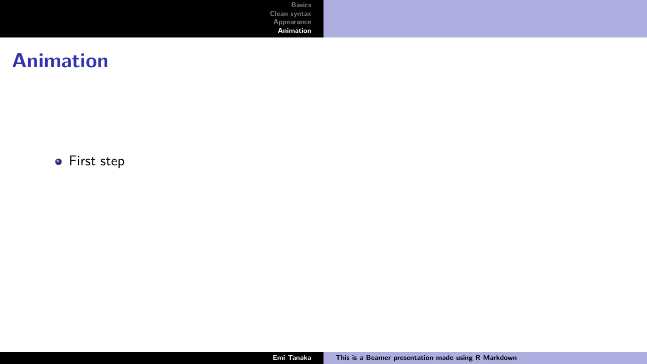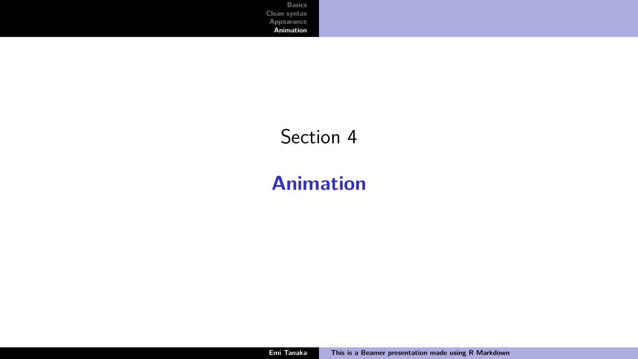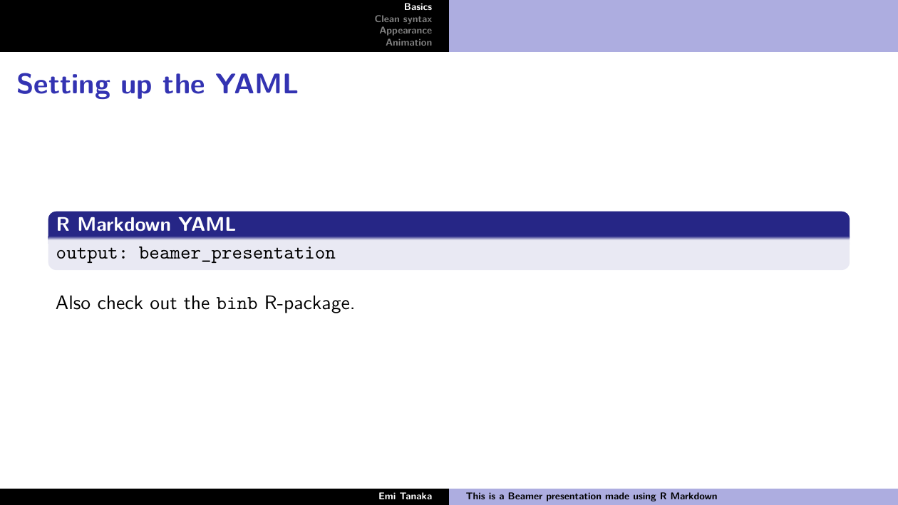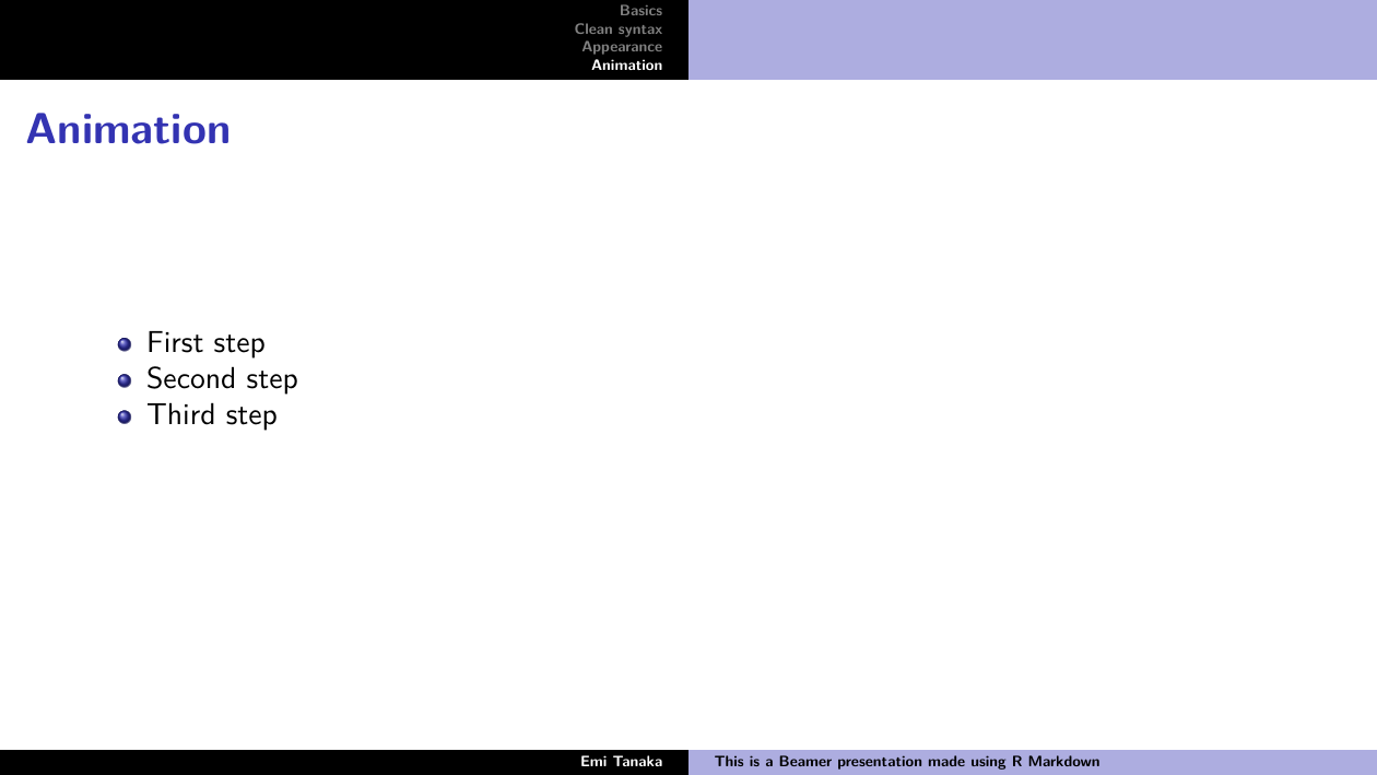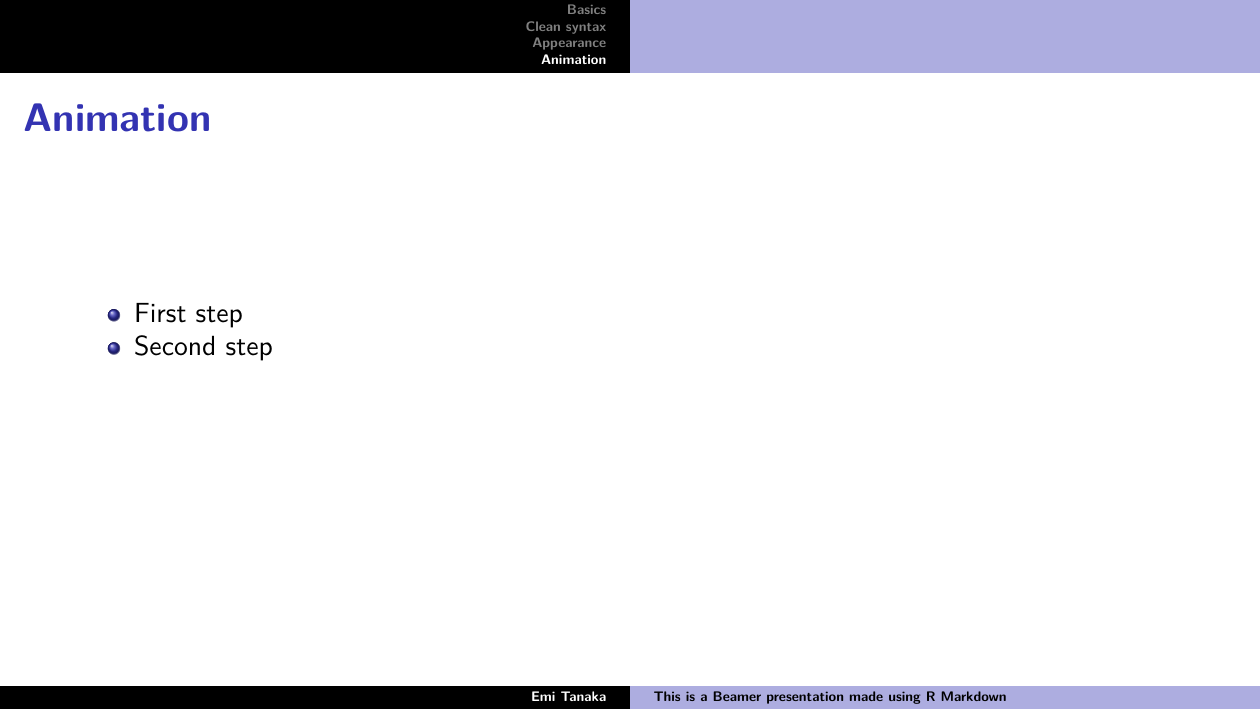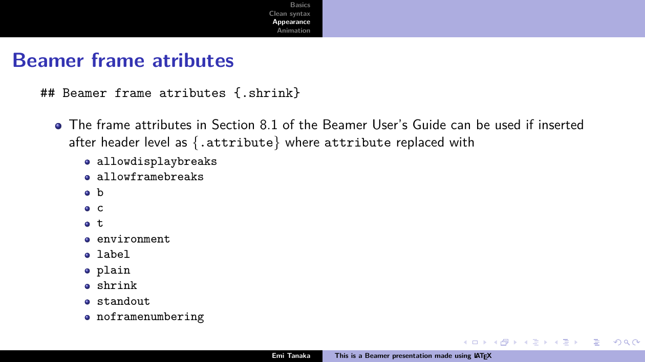 <br> This talk is NOT about: -- <br> <i class='fa fa-times'></i> how to present well or communicate -- <br> <i class='fa fa-times'></i> how to design your slides --- class: monash-bg-blue center middle white <span style="font-size:3em">🎯</span> <br> <i class='fas fa-check'></i> Learn about Beamer <i class="fas fa-handshake"></i> R Markdown -- <br> <i class='fas fa-check'></i> Why care about R Markdown? -- <br> <i class='fas fa-check'></i> Get started with `xaringan` = R Markdown <i class="fas fa-handshake"></i> `remark.js` <i class="fas fa-user-plus"></i> HTML/CSS/JS -- <br> <i class='fas fa-check'></i> Why HTML slides? -- <br> <i class="fas fa-question-circle"></i> Questions? Do ask away! <span style="font-size:3em">👩🏻💻</span> --- background-image: url("images/bg3.jpg") background-size: cover <div class="cursive-font" style="font-size:34pt!important;position:absolute;top:50%;left:30%;transform:rotate(6deg);width:500px;"> For the beamer users who are yet to use <br>R Markdown </div> --- # Beamer LaTeX document class .grid[ .item[ `example-beamer-clean.tex` .scroll-fit50[ ````{=latex} \documentclass[10pt,aspectratio=169]{beamer} \usepackage{amssymb,amsmath} \usepackage{lmodern} \usepackage{hyperref, url} \usetheme{Copenhagen} \usecolortheme{dolphin} \usefonttheme{structurebold} \title{This is a Beamer presentation made using \LaTeX} \subtitle{} \author{Emi Tanaka} \date{30th June 2020} \institute{Monash University} \begin{document} \frame{\titlepage} \begin{frame} \tableofcontents[hideallsubsections] \end{frame} \section{Basics} \begin{frame}{Setting up the YAML} \begin{block}{R Markdown YAML} \texttt{output:\ beamer\_presentation} \end{block} Also check out the \href{https://github.com/eddelbuettel/binb}{\texttt{binb} R-package}. \end{frame} \section{Clean syntax} \begin{frame}{Example: Writing mathematics is as usual} Consider a general linear mixed models: $\boldsymbol{y} = \mathbf{X}\boldsymbol{\beta} + \mathbf{Z}\boldsymbol{u} + \boldsymbol{e}$ where \begin{itemize} \item $\boldsymbol{y}$ is a $n\times 1$ vector of observations, \item $\mathbf{X}$ is a $n\times p$ design matrix for fixed effects $\boldsymbol{\beta}$, \item $\mathbf{Z}$ is a $n\times q$ design matrix for fixed effects $\boldsymbol{u}$, and \item $\boldsymbol{e}$ is a $n\times 1$ vector of random error. \end{itemize} \end{frame} \begin{frame}[fragile]{Simplified content writing: itemized list} \begin{columns}[T] \begin{column}{0.48\textwidth} \begin{block}{Plain \LaTeX} \small \begin{verbatim} \begin{itemize} \item $\boldsymbol{y}$ is a $n\times 1$ vector of observations, \item $\mathbf{X}$ is a $n\times p$ design matrix for fixed effects $\boldsymbol{\beta}$$, \item $\mathbf{Z}$ is a $n\times q$ design matrix for fixed effects $\boldsymbol{u}$, and \item $\boldsymbol{e}$ is a $n\times 1$ vector of random error. \end{itemize} \end{verbatim} \end{block} \end{column} \begin{column}{0.48\textwidth} \begin{block}{Markdown syntax} \small \vspace{0.5cm} \begin{verbatim} * $\boldsymbol{y}$ is a $n\times 1$ vector of observations, * $\mathbf{X}$ is a $n\times p$ design matrix for fixed effects $\boldsymbol{\beta}$, * $\mathbf{Z}$ is a $n\times q$ design matrix for fixed effects $\boldsymbol{u}$, and * $\boldsymbol{e}$ is a $n\times 1$ vector of random error. \end{verbatim} \end{block} \end{column} \end{columns} \end{frame} \begin{frame}[fragile]{Make new frame} \begin{columns}[T] \begin{column}{0.48\textwidth} Instead of \begin{block}{\LaTeX} \begin{verbatim} \begin{frame}{Title} Content \ end{frame} \end{verbatim} \end{block} do \begin{block}{markdown} \begin{verbatim} ## Title Content \end{verbatim} \end{block} \end{column} \begin{column}{0.48\textwidth} In the \textbf{R Markdown YAML} set: \begin{verbatim} output: beamer_presentation: slide_level: 2 \end{verbatim} \begin{itemize} \item then a heading at slide level starts a new frame; or \item a horizontal line, like \texttt{-\/-\/-}, starts a new frame. \end{itemize} \end{column} \end{columns} \end{frame} \begin{frame}[fragile]{Multi-column output} Stick with \LaTeX or Pandoc syntax (both will work) \begin{columns}[T] \begin{column}{0.48\textwidth} \begin{block}{Plain \LaTeX} \begin{verbatim} \begin{columns} \begin{column}{0.5\textwidth} Column 1 content \end{column} \begin{column}{0.5\textwidth} Column 2 content \end{column} \end{columns} \end{verbatim} \end{block} \end{column} \begin{column}{0.48\textwidth} \begin{block}{Pandoc syntax} \begin{verbatim} :::: columns ::: column Column 1 content ::: ::: column Column 2 content ::: :::: \end{verbatim} \end{block} \end{column} \end{columns} \end{frame} \section{Appearance} \begin{frame}[fragile]{Pandoc options} \begin{itemize} \item See \href{https://pandoc.org/MANUAL.html\#variables-for-beamer-slides}{Pandoc manual} for all the variables available to modify in the YAML. \begin{itemize} \item E.g. \texttt{aspectratio:\ 43} for 4:3 ratio. \end{itemize} \item See also \href{https://pandoc.org/MANUAL.html\#producing-slide-shows-with-pandoc}{Producing slide shows with pandoc} \begin{itemize} \item E.g. Speaker notes \end{itemize} \end{itemize} \end{frame} \begin{frame}[fragile,shrink]{Beamer frame atributes} \begin{verbatim} ## Beamer frame atributes {.shrink} \end{verbatim} \begin{itemize} \item The frame attributes in Section 8.1 of the \href{http://mirror.aarnet.edu.au/pub/CTAN/macros/latex/contrib/beamer/doc/beameruserguide.pdf}{Beamer User's Guide} can be used if inserted after header level as \texttt{\{.attribute\}} where \texttt{attribute} replaced with \begin{itemize} \item \texttt{allowdisplaybreaks} \item \texttt{allowframebreaks} \item \texttt{b} \item \texttt{c} \item \texttt{t} \item \texttt{environment} \item \texttt{label} \item \texttt{plain} \item \texttt{shrink} \item \texttt{standout} \item \texttt{noframenumbering} \end{itemize} \end{itemize} \end{frame} \section{Animation} \begin{frame}[fragile]{Animation} \begin{itemize}[<+->] \item First step \item Second step \item Third step \end{itemize} \pau