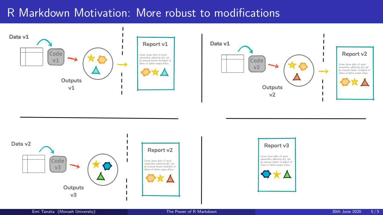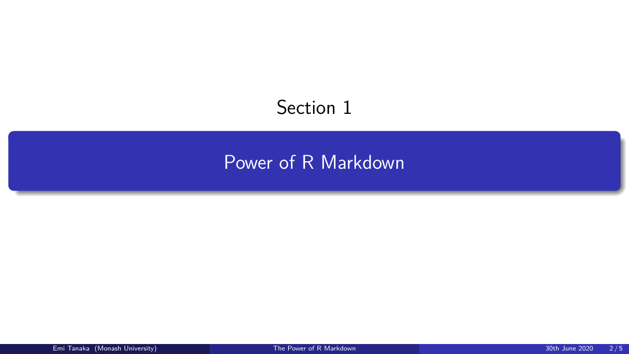 background-color: #006DAE class: middle center hide-slide-number <div class="shade_black" style="width:60%;right:0;bottom:0;padding:10px;border: dashed 4px white;margin: auto;"> <i class="fas fa-exclamation-circle"></i> These slides are viewed best by Chrome and occasionally need to be refreshed if elements did not load properly. See <a href=/>here for PDF <i class="fas fa-file-pdf"></i></a>. </div> <br> .white[Press the **right arrow** to progress to the next slide!] --- background-image: url(images/bg1.jpg) background-size: cover class: hide-slide-number title-slide count: false <div style="position: absolute; left: 30%; top: 15%; width:50%"> <h1 class="monash-blue">Beyond Beamer</h1> <h2 style="font-weight:900!important;">Modern and Dynamic Presentations with<br> R Markdown</h2> </div> .bottom_abs.width100.shade_black[ <img src="images/monash-logo.png" style="float:right;" height = "120px"/> **Emi Tanaka** Department of Econometrics and Business Statistics