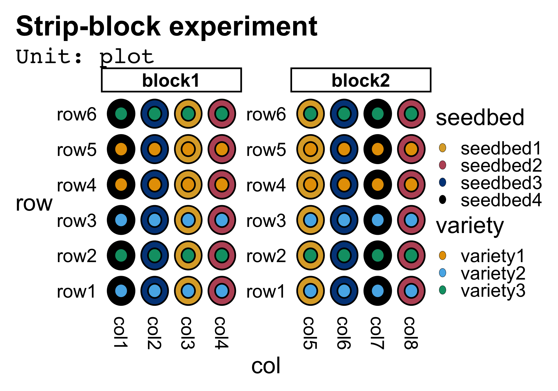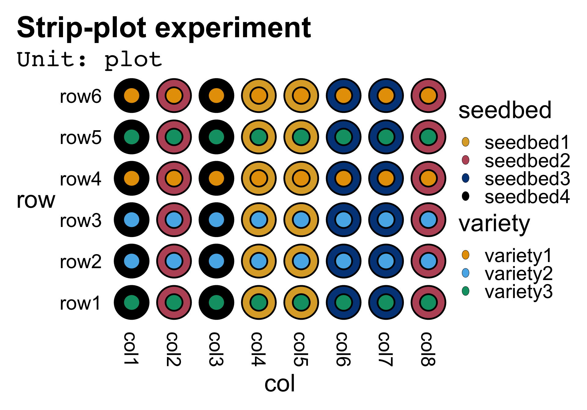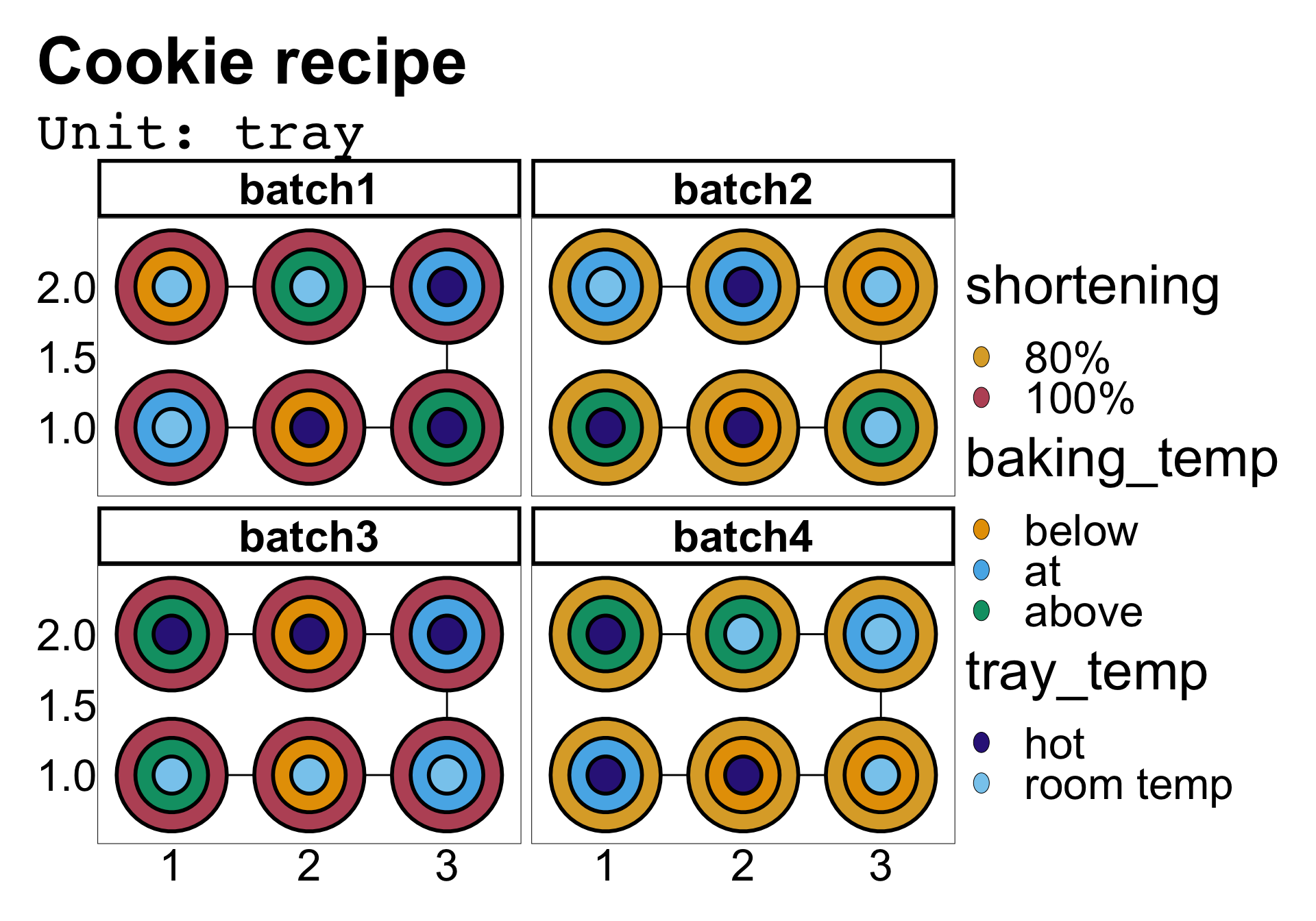 Recipes for chocolate and orange cookies include exactly the same ingredients up to the point where the syrup was added to the batch. However, after the cookies were baked, the chocolate cookies had an appealing round and plump appearance, while the orange cookies spread during the baking process and became thin, flat, and unappealing. A factorial experiment was devised to determine if there was a way to change the process of making the orange cookies that would reduce the spreading during baking. The factors that were chosen to be varied were A: the amount of shortening in the dough batch (80% of what the recipe called for or 100%), B: the baking temperature (below, at, or above the temperature called for by the recipe), and C: the temperature of the cookie sheet upon which the cookies were placed to be baked (hot out of the oven, or cooled to room temperature). The cookie-making process consists of the two steps: 1. mix cookie dough batch, and 2. bake cookies. Factor A is related to step 1, factors B and C to step 2. The amount of shortening was a hard-to-vary factor because each time it was changed it required making a new batch of cookie dough, while the baking temperature and tray temperature were easy to vary. Once a batch of dough was made, there was enough to make six trays of cookies, and all six combinations of baking temperature and tray temperature could be tested within each dough batch. First, plan to make four batches of cookie dough and randomly assign two batches to use 80% of the recipe recommended amount of shortening and two batches to receive the full amount of shortening recommended by the recipe. Next, bake six trays of cookies from each batch of dough and completely randomize the six combinations of bake temperature and tray temperature to the six trays of cookies within each batch.