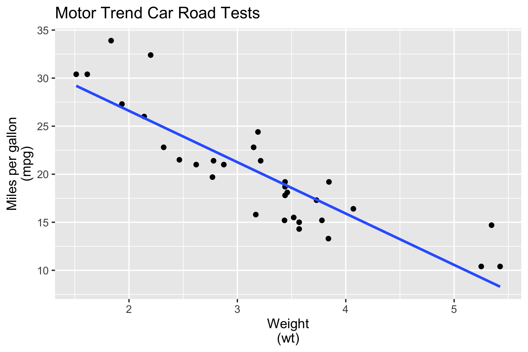 \[\texttt{mpg}_i = \beta_0 + \beta_1\texttt{wt}_i + e_i\]