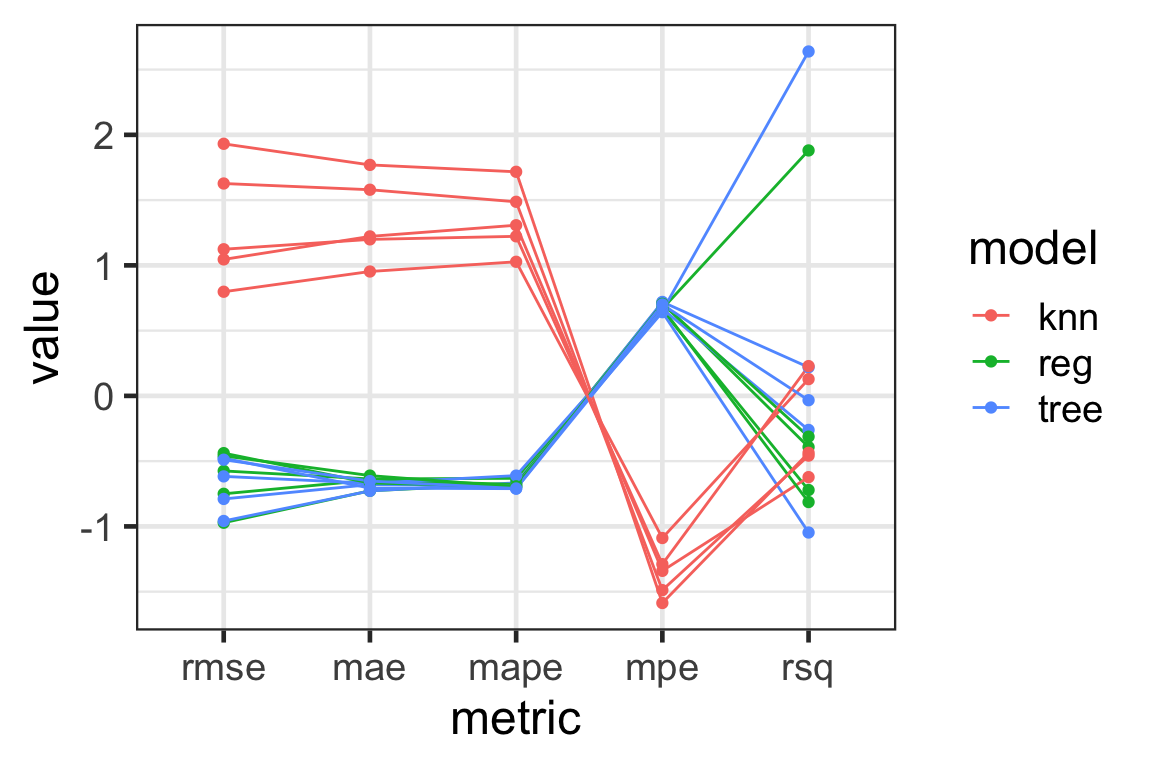 knn has a large variation in the metrics - this means this model has a high variance and it is not desirable.tree and reg has a large variation in rmse and rsq - they are somewhat similar in performance.rsample package has a specific function for this special case that is essentially similar to above:# Leave-one-out cross-validation