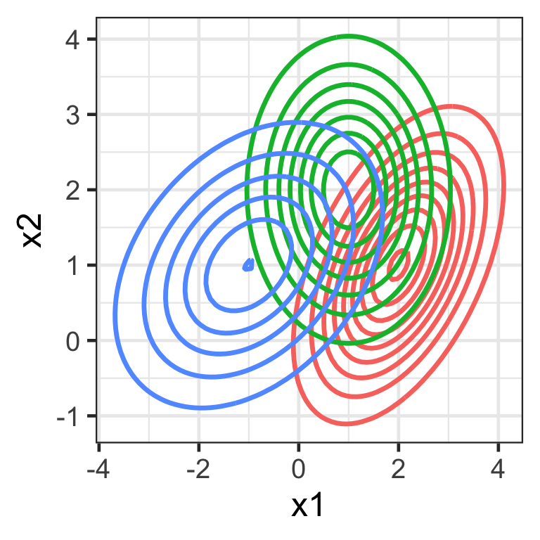 Recall, we assume that \boldsymbol{X}_{k} \sim N(\boldsymbol{\mu}_{k}, \mathbf{\Sigma}_k) for k = 1, \dots, K.