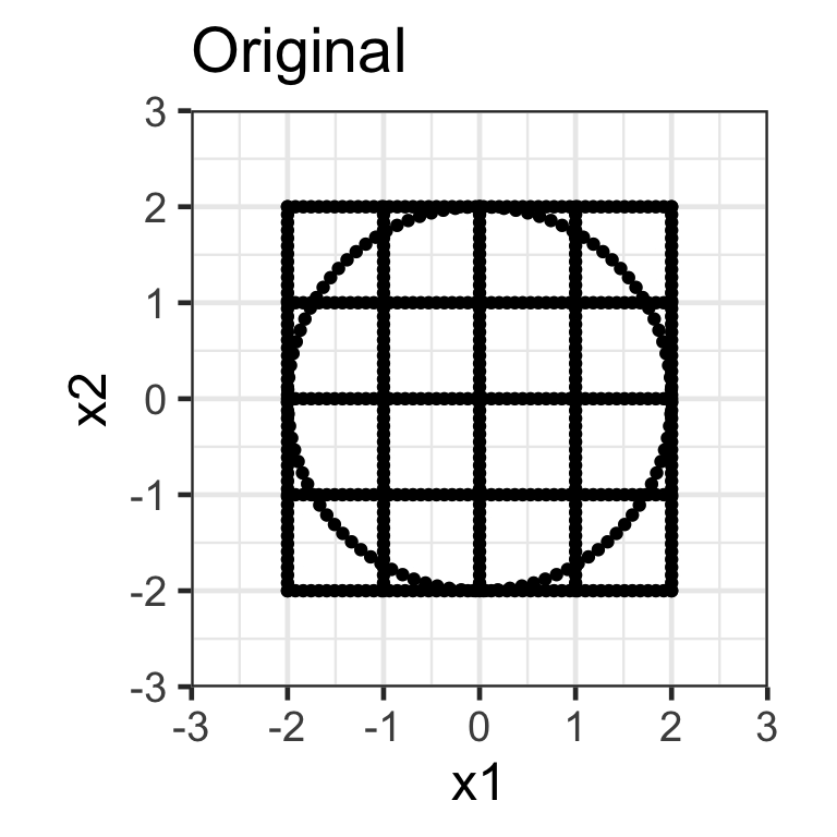 • Applying the transformation \mathbf{X}_{n\times 2}\mathbf{R}_{2\times 2} where \mathbf{R}_{2\times2} = \begin{bmatrix}\cos(\theta) & -\sin(\theta) \\\sin(\theta) & \cos(\theta) \end{bmatrix} rotates the data around the origin by an angle of \theta in the counterclockwise direction.
