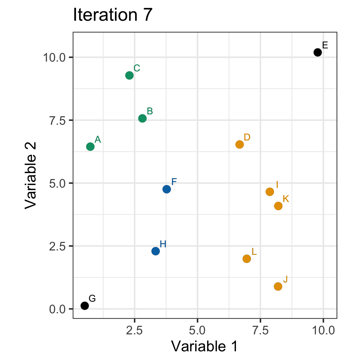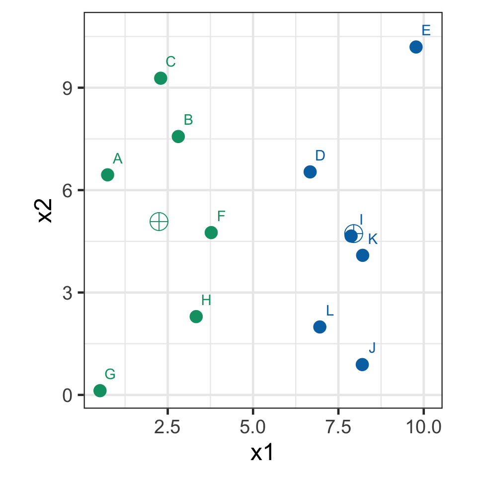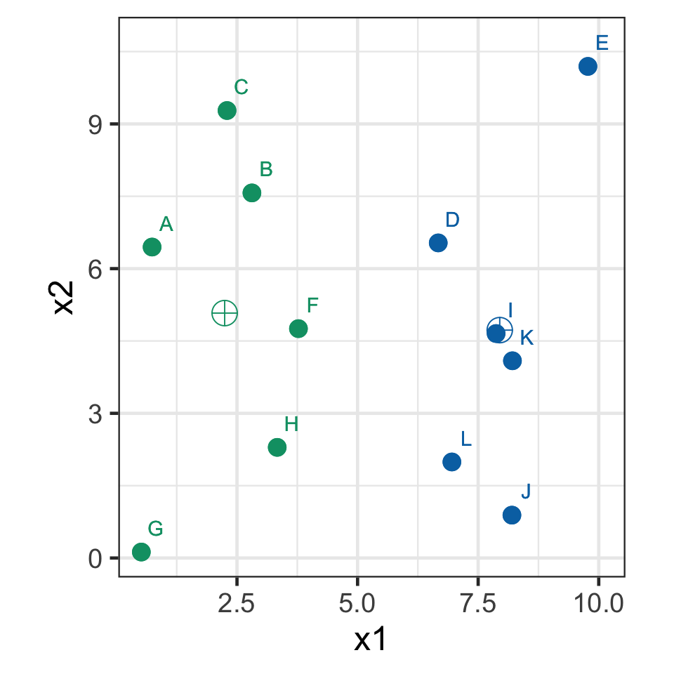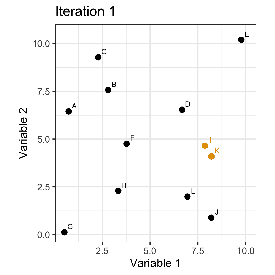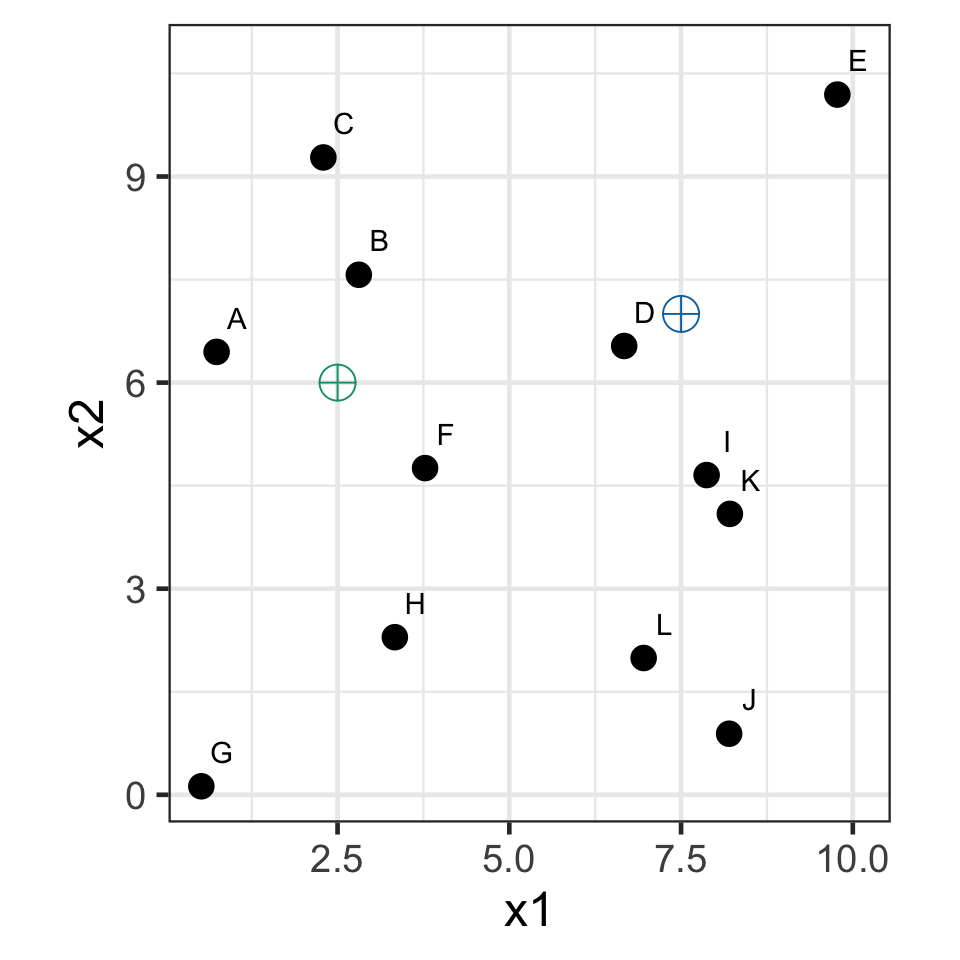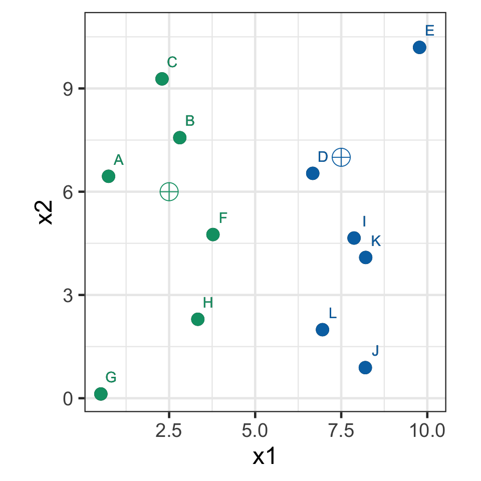 Minimises the total within-cluster sum of squares: W = \sum_{k = 1}^g \left(\sum_{i\in\mathcal{A}_k}\sum_{j=1}^p\left(x_{ij} - \bar{x}_{\cdot j}\right)^2\right) where: